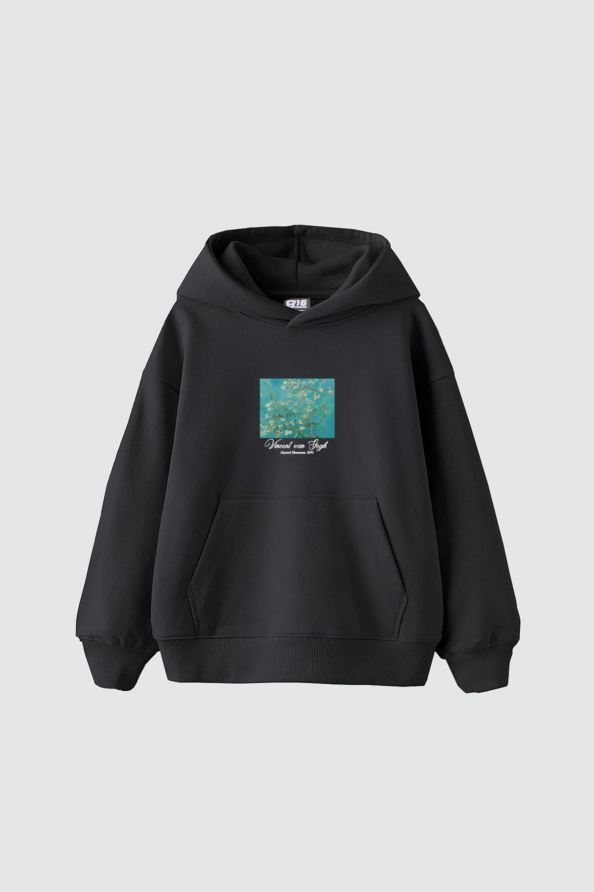 Almond Blossoms Baskılı Oversize Unisex Siyah Hoodie
