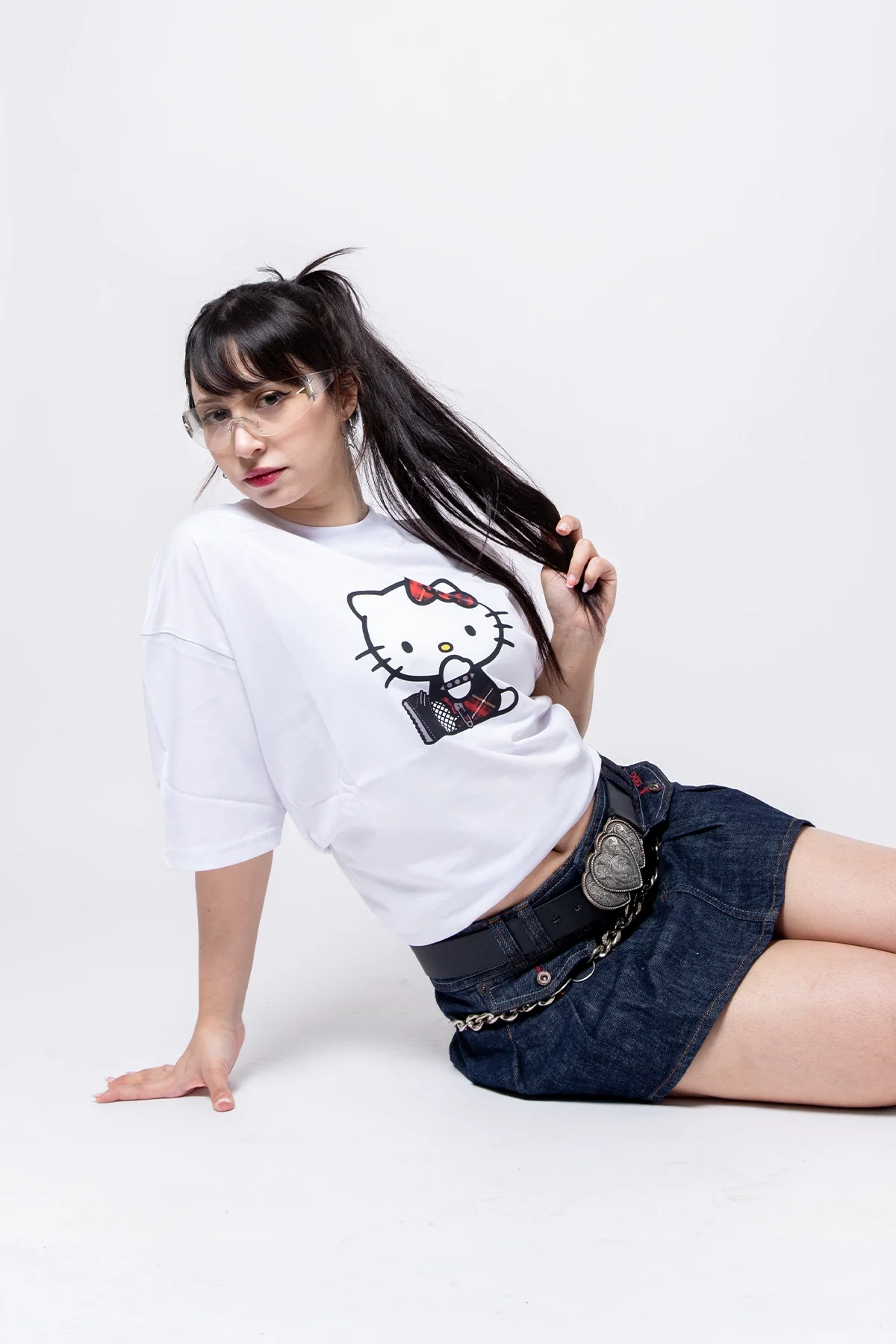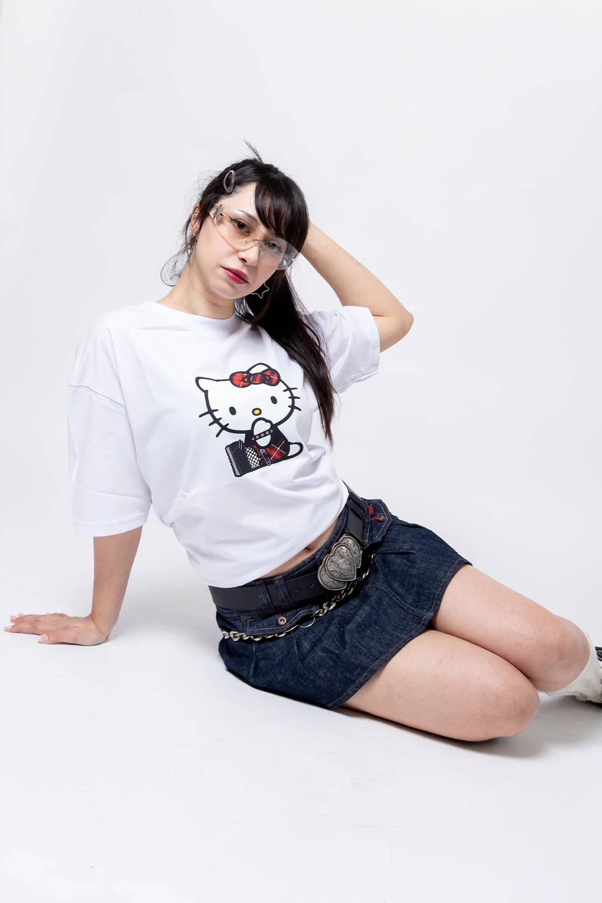 Punk H. Kitty Baskılı Oversize Unisex Beyaz Tshirt