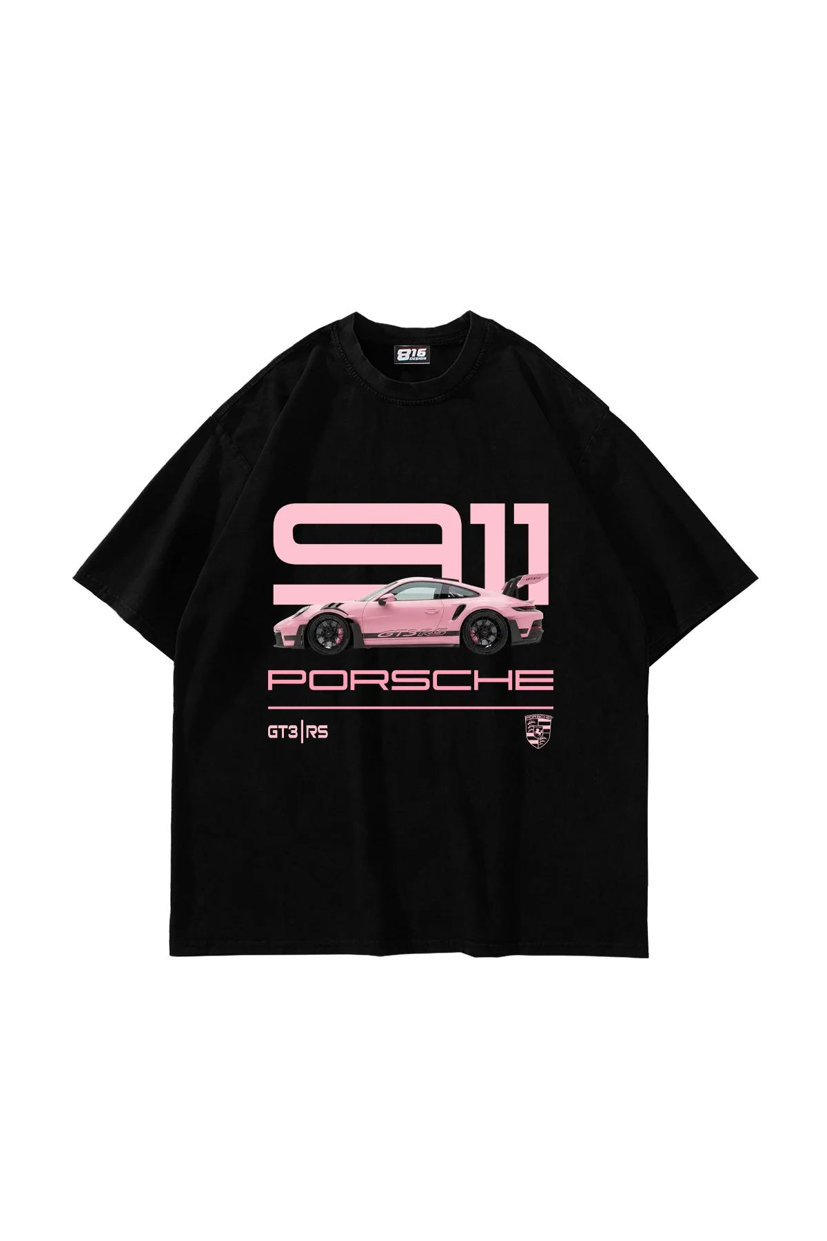 911 Pink Baskılı Oversize Unisex Siyah Tshirt