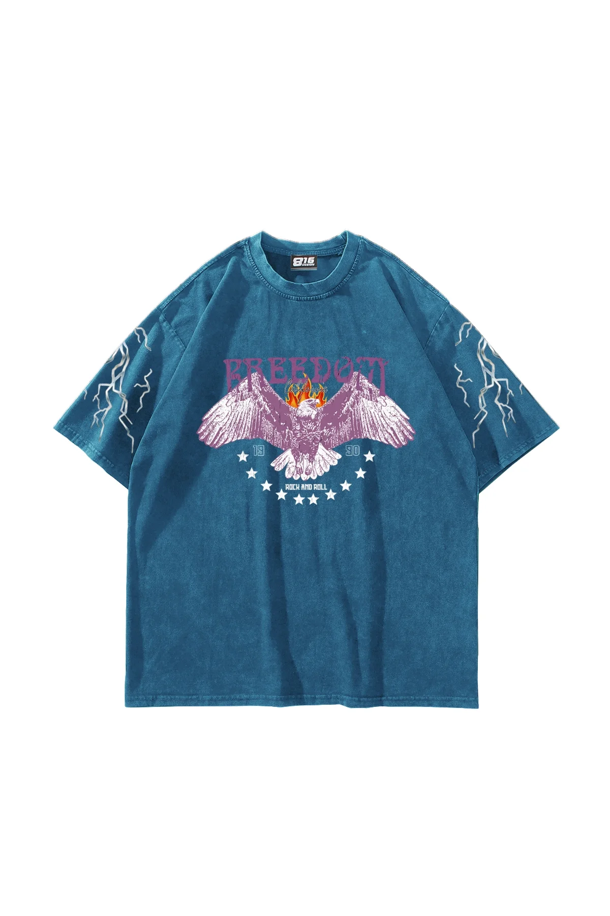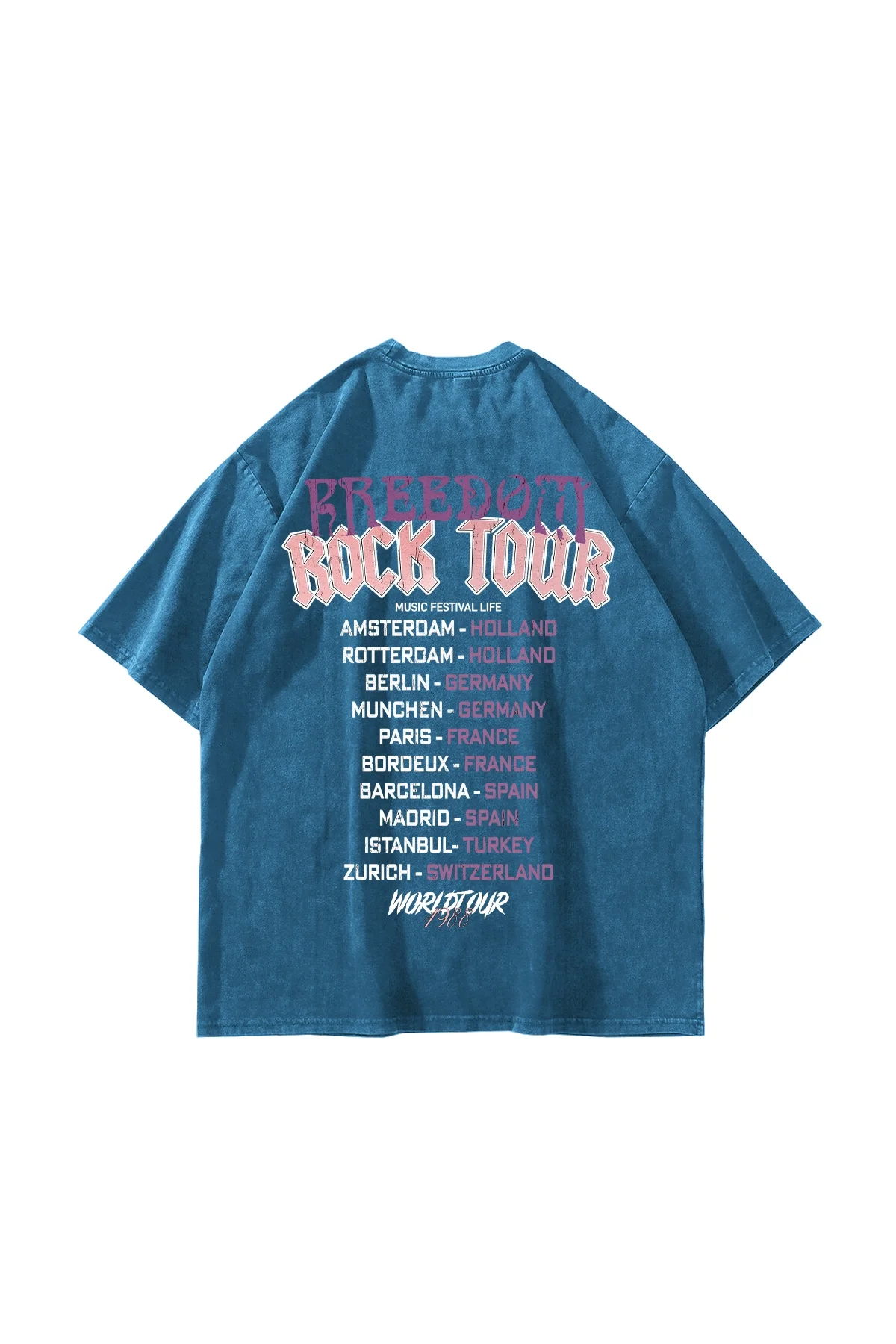 Freedom Rock Tour Baskılı Oversize Unisex Yıkamalı Mavi Tshirt