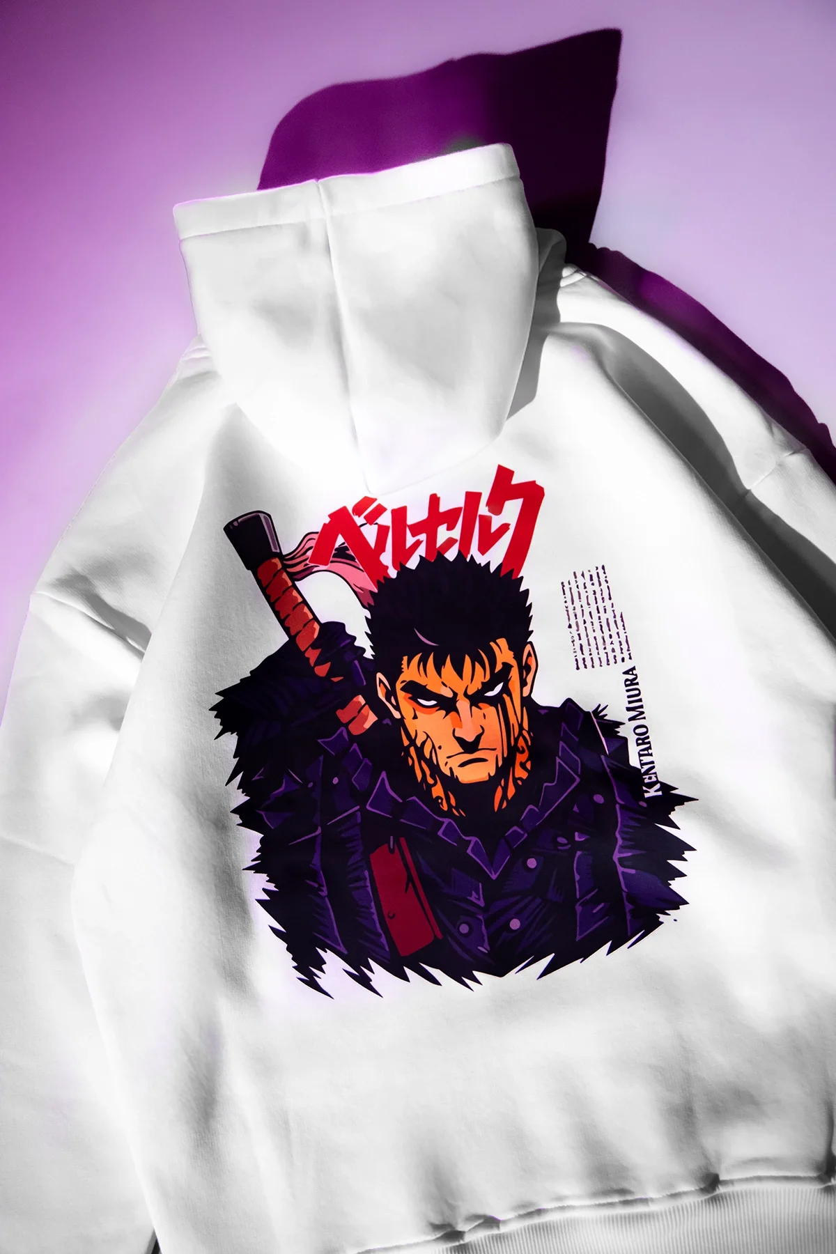 Berserk Guts Baskılı Hoodie, oversize kesimi ve zamansız Beyaz rengiyle hem konforu hem tarzı bir araya getiriyor. Göğüs kısmındaki yazısı ve baskı detayıyla enerjik ve özgün bir görünüm sunar.