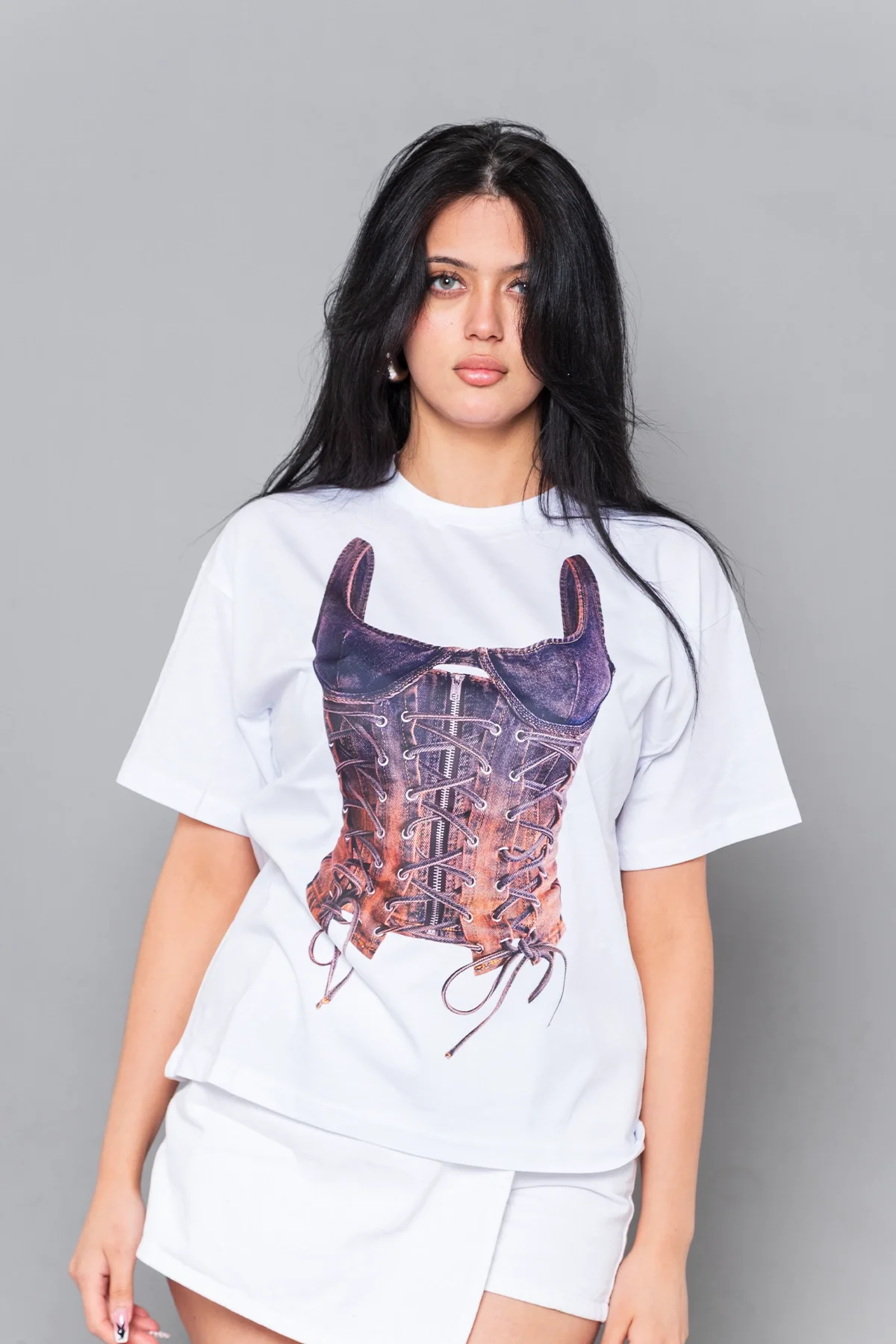 Denim Corset Baskılı Relaxed Fit Beyaz Kadın T-Shirt