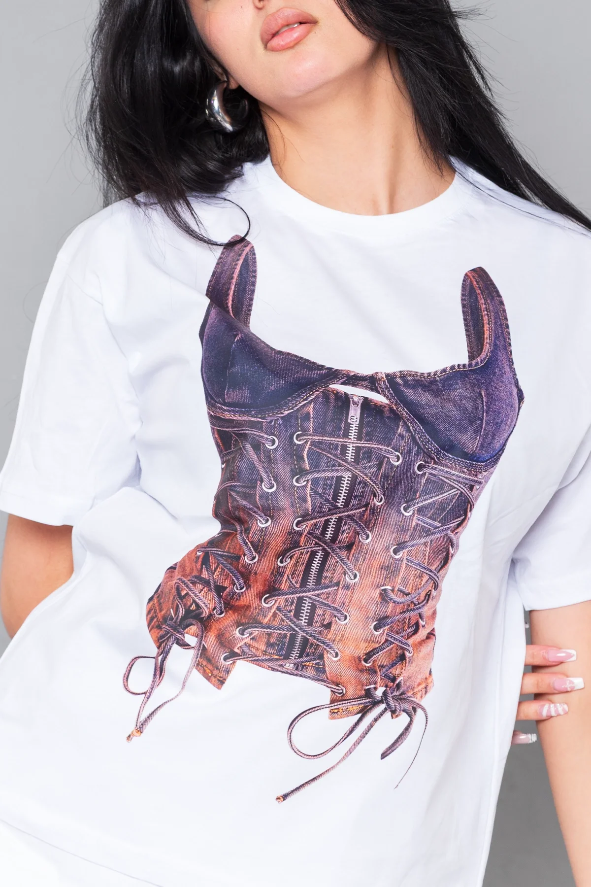 Denim Corset Baskılı Relaxed Fit Beyaz Kadın Tshirt