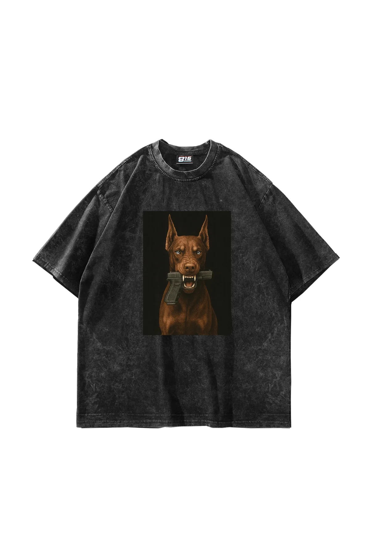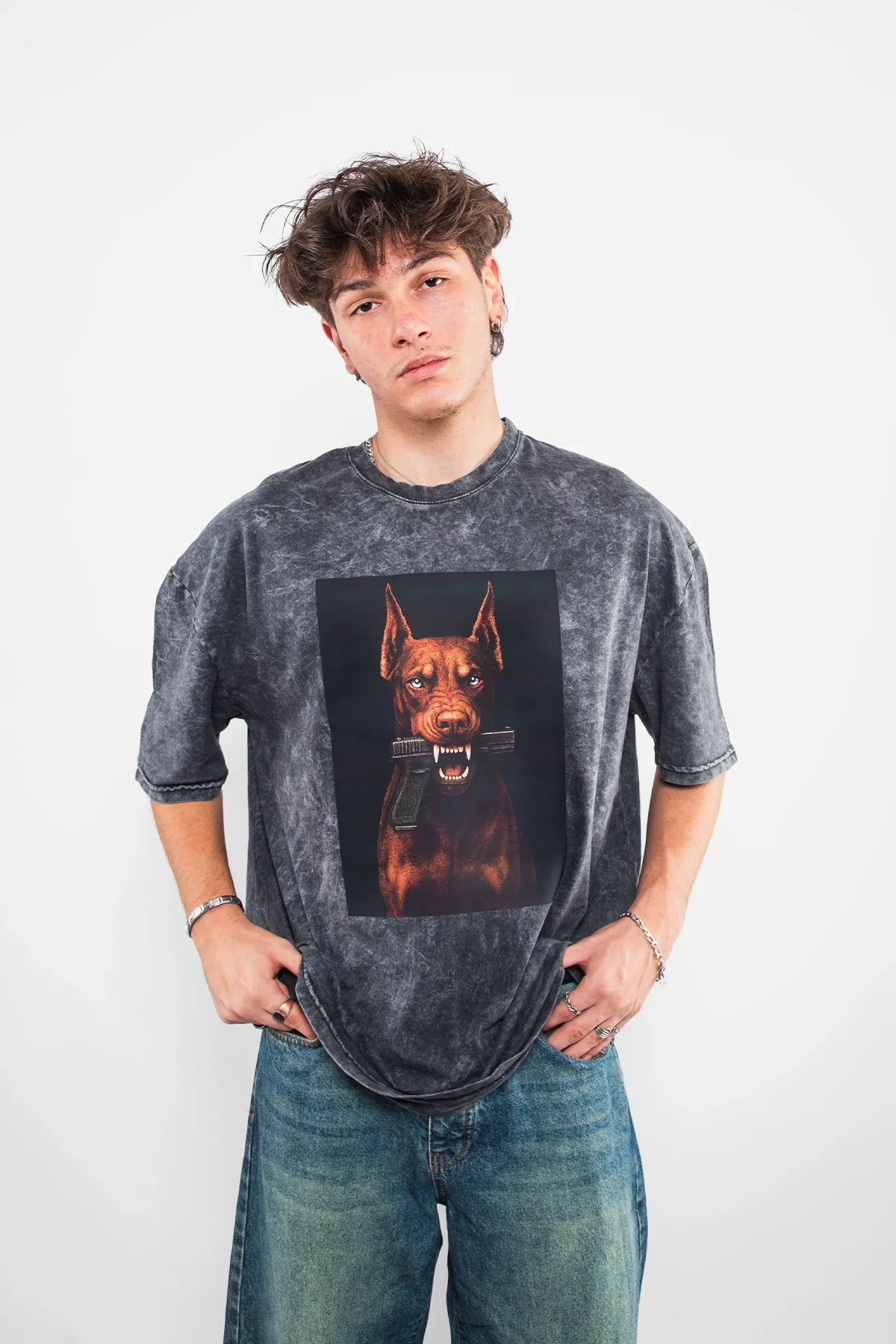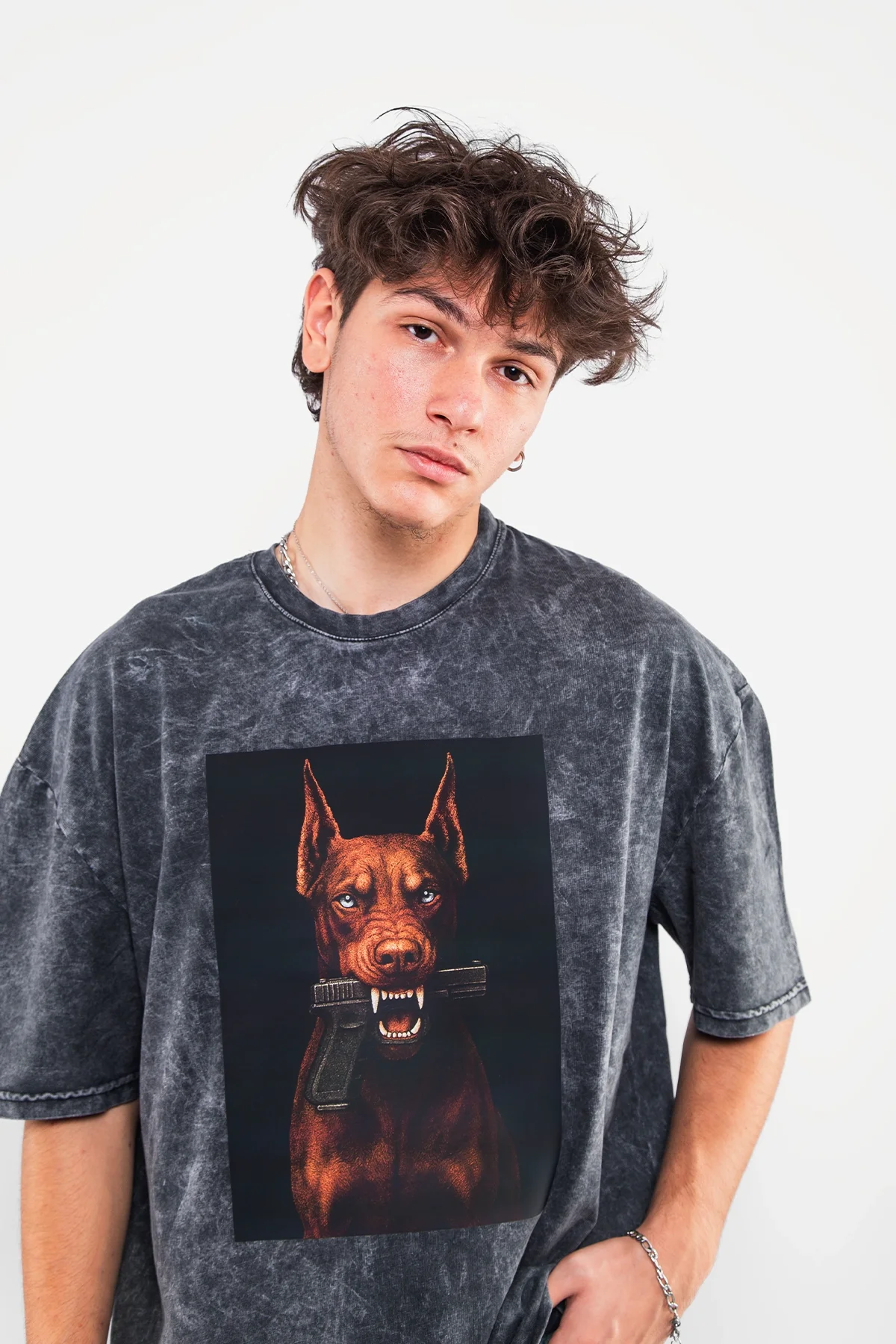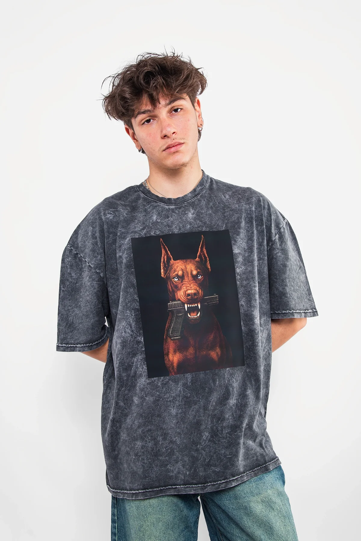 Doberman V2 Baskılı Oversize Unisex Yıkamalı Siyah Tshirt