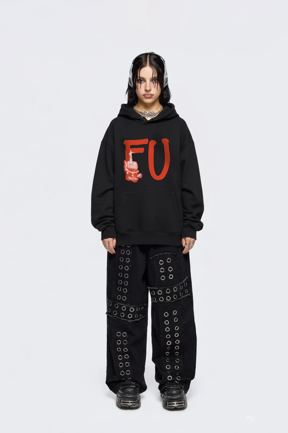 FU. Baskılı Oversize Unisex Siyah Hoodie