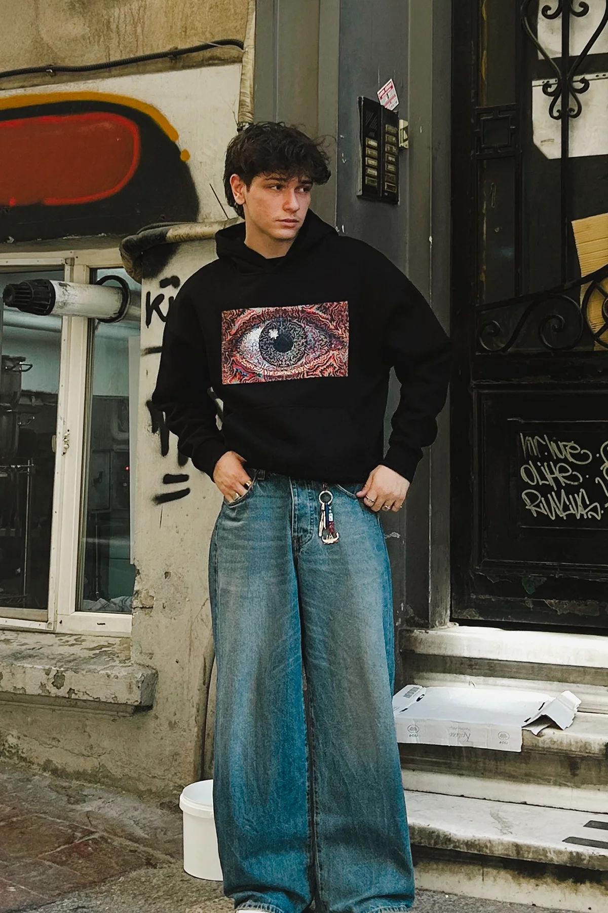 Eye Hallucination Baskılı Oversize Unisex Siyah Hoodie