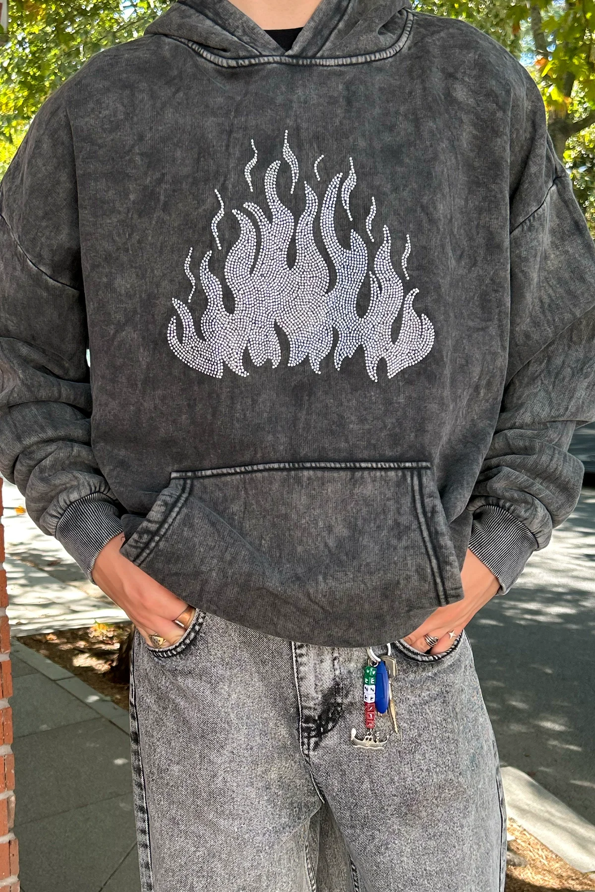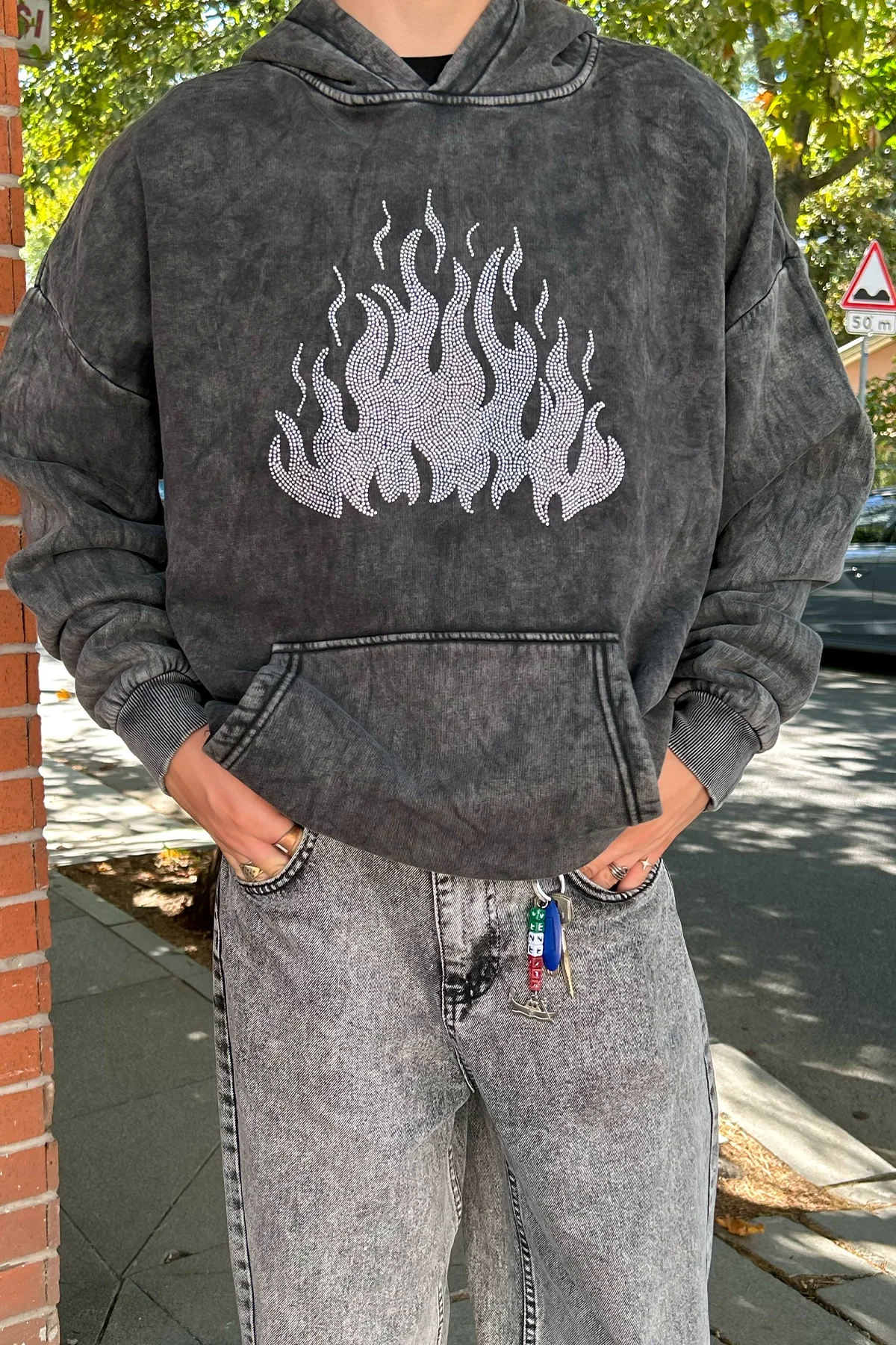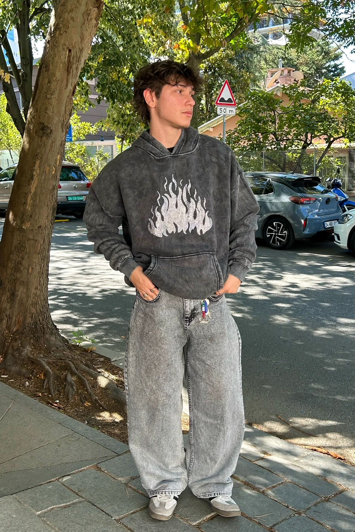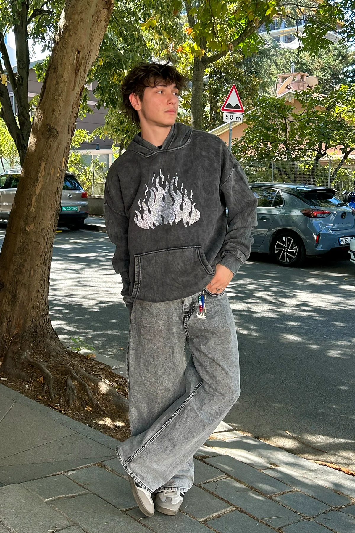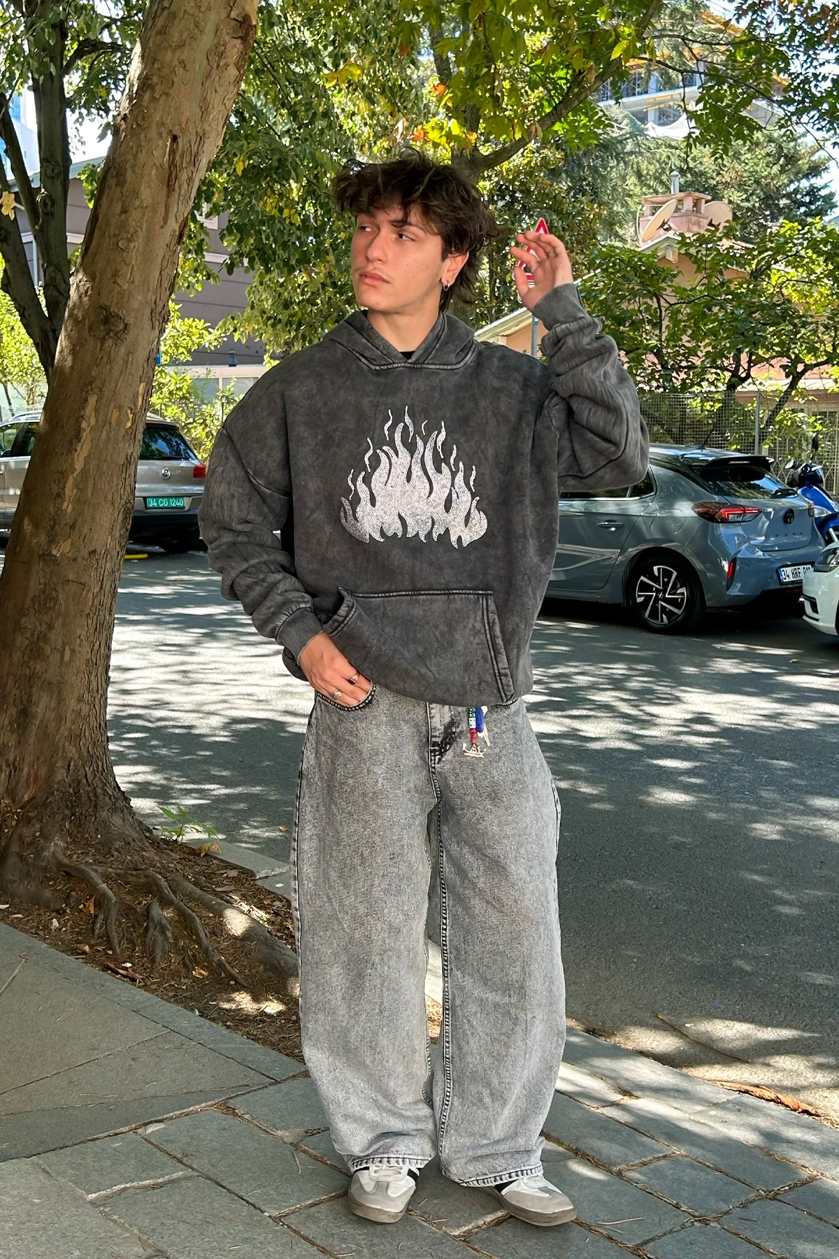 Flame Taş Baskılı Oversize Yıkamalı Siyah Hoodie