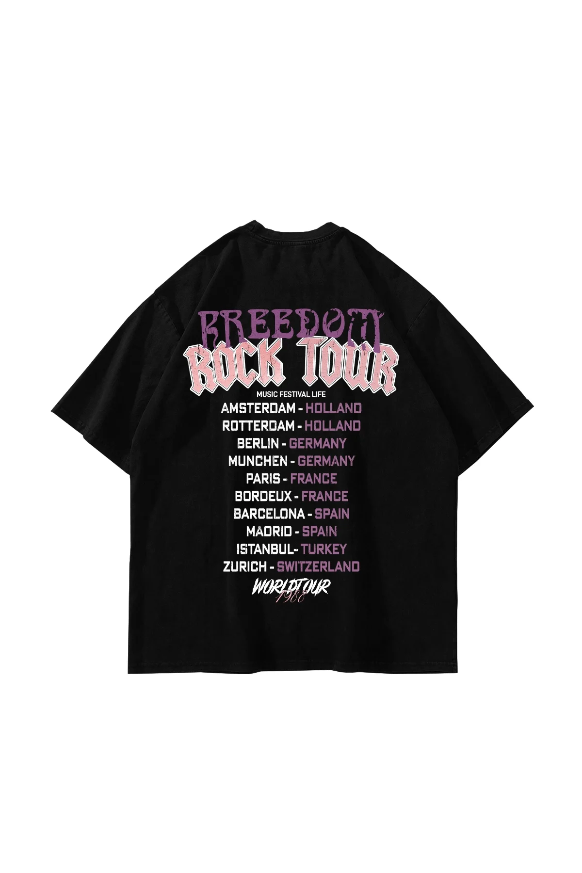 Sokak stiline asi ve özgün bir dokunuş ekleyin! Freedom Rock Tour baskılı Siyah oversize unisex t-shirt, enerjik tasarımı ve rahat kesimiyle her ortamda dikkat çeker. Hem erkekler h em de kadınlar i çin ideal olan bu t-shirt, cesur bir tarz arayanların tercihi olacak.