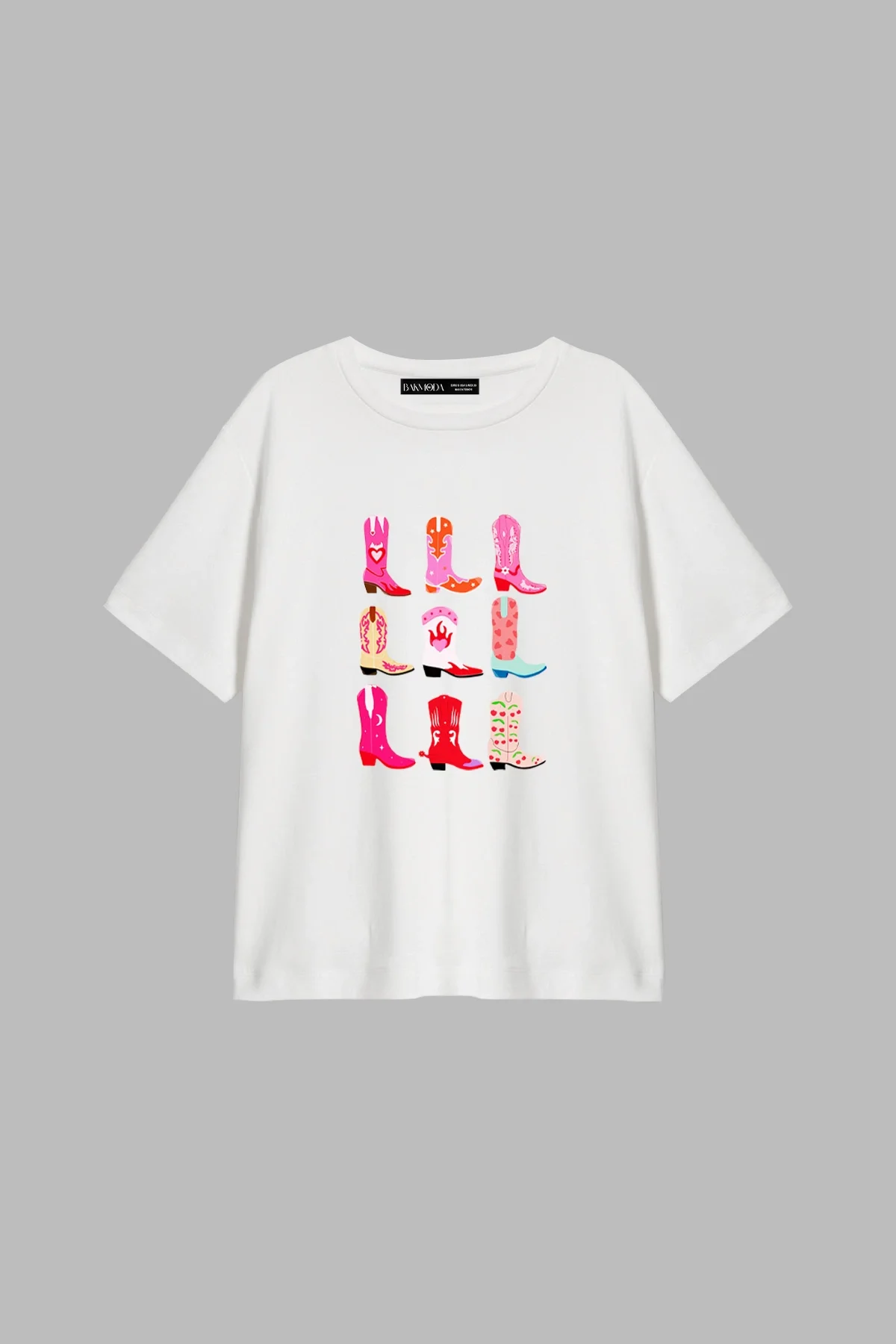 Fun Cowboy Baskılı Relaxed Fit Beyaz Kadın Tshirt