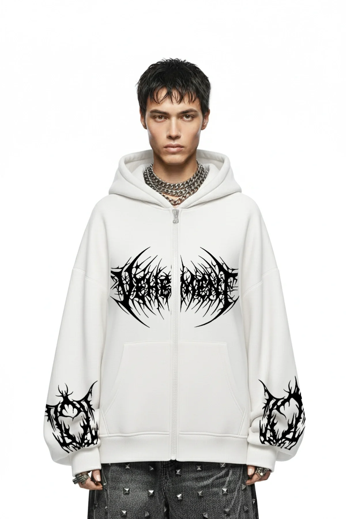 Vehement Baskılı Fermuarlı Zip Kapüşonlu Unisex Beyaz Sweatshirt