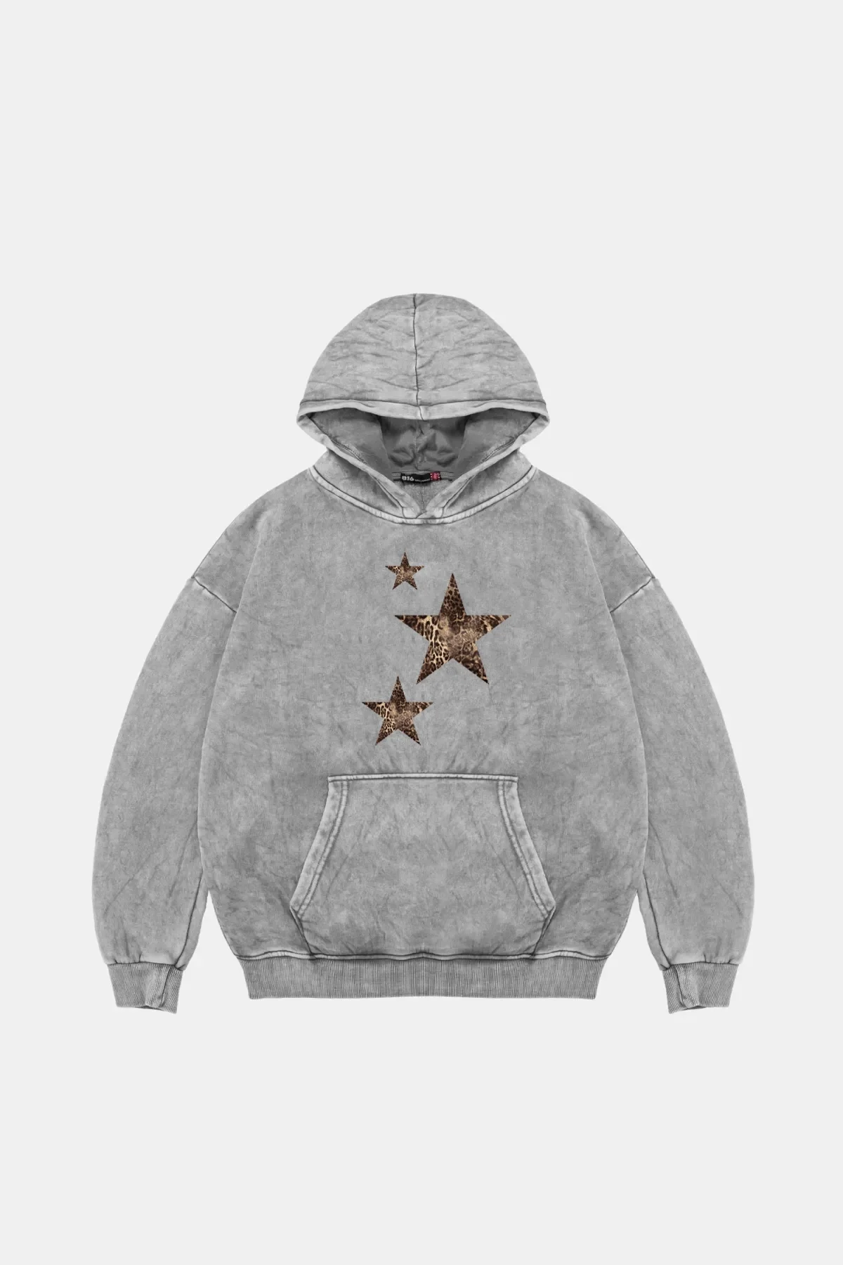 Leopar Yıldız Baskılı Oversize Unisex Yıkamalı Beyaz Hoodie