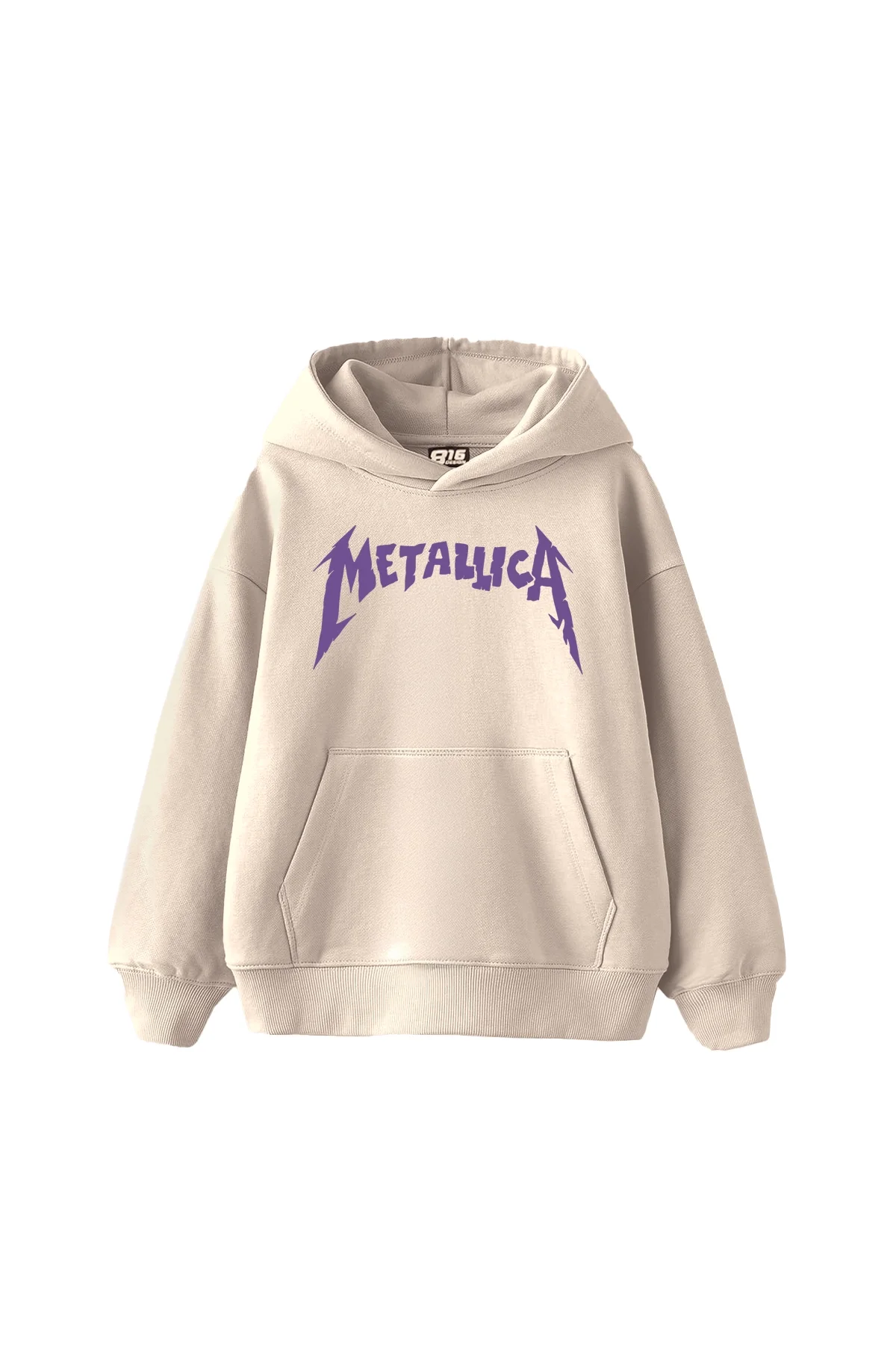 Metallica Mor Sırt Baskılı Bej Oversize Kapüşonlu Hoodie