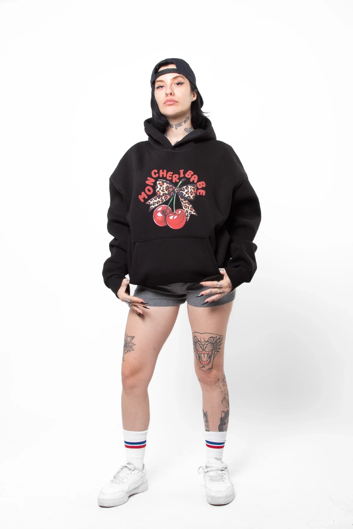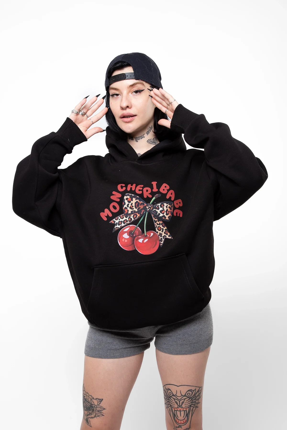 Mon Cherie Baskılı Oversize Unisex Siyah Hoodie