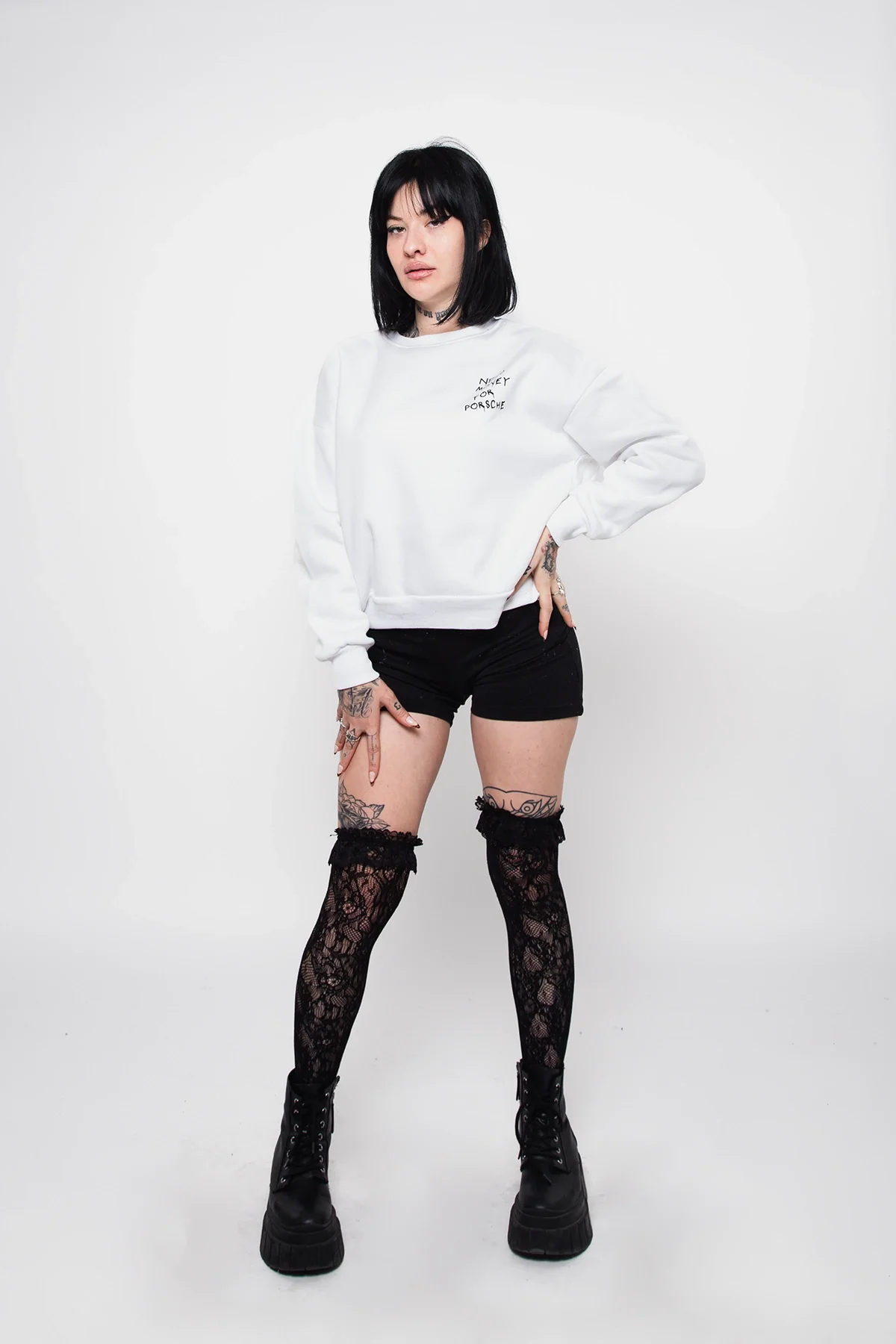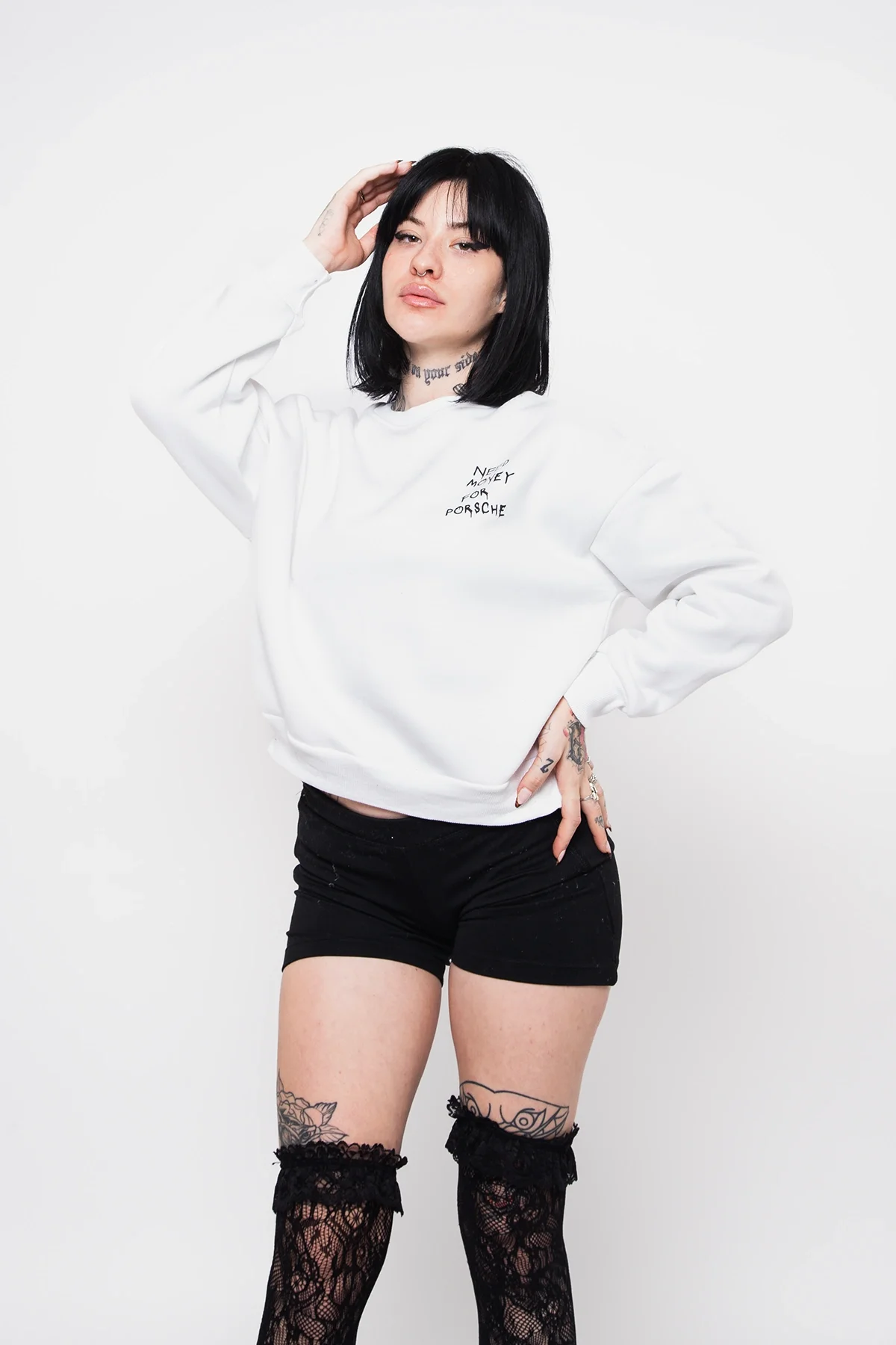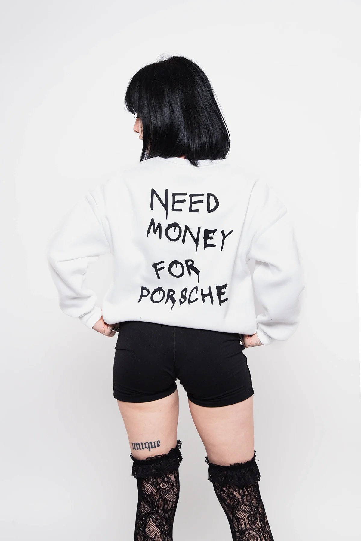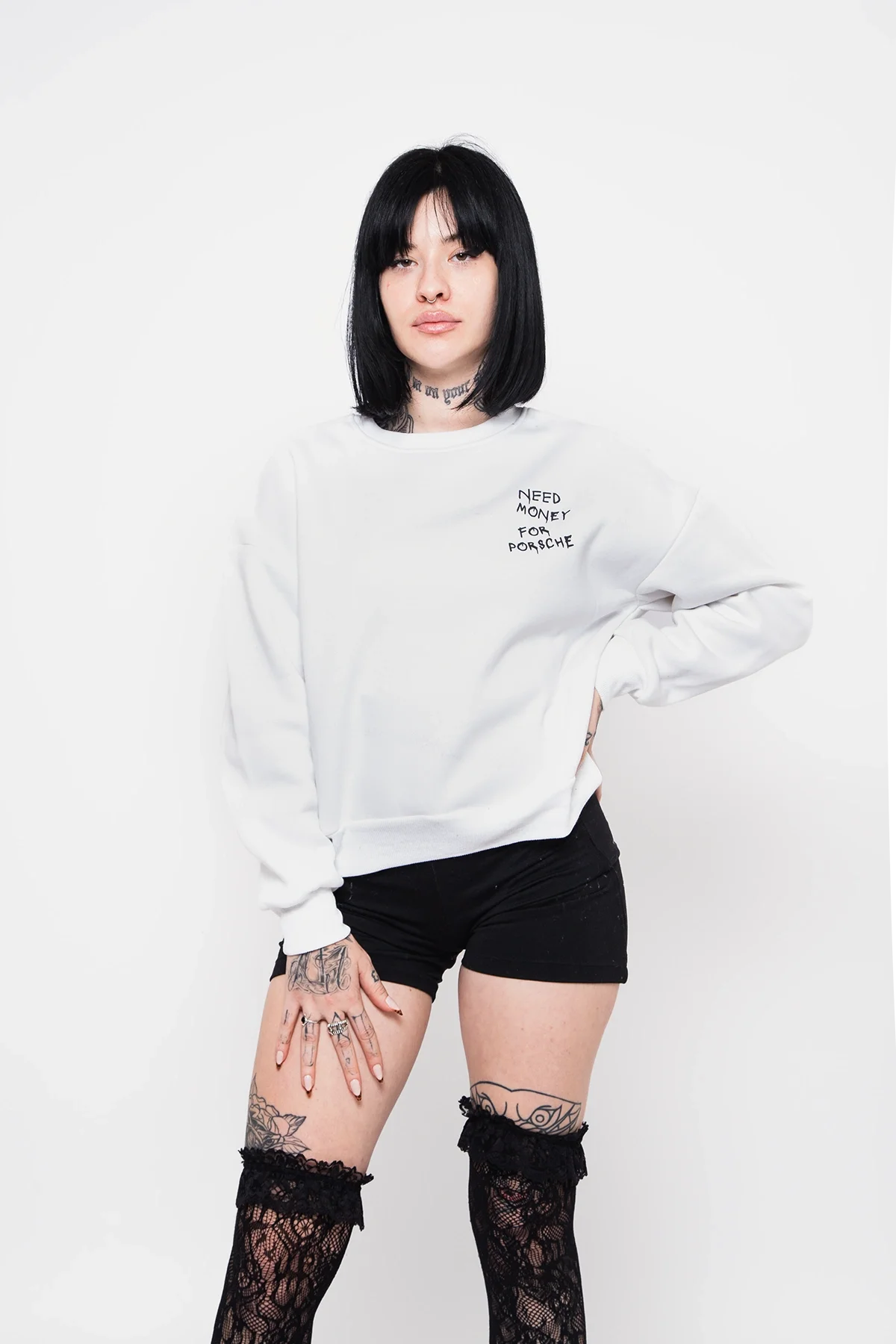 Need Money For Porsche Baskılı Kapüşonsuz Relaxed Fit Kadın Beyaz Sweatshirt