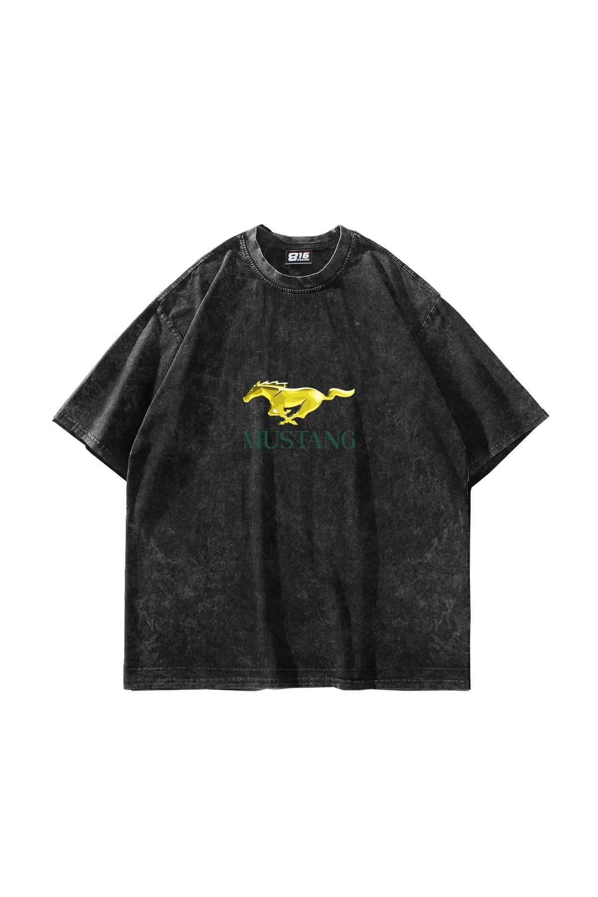 Old Mstng Baskılı Oversize Unisex Yıkamalı Siyah T-Shirt