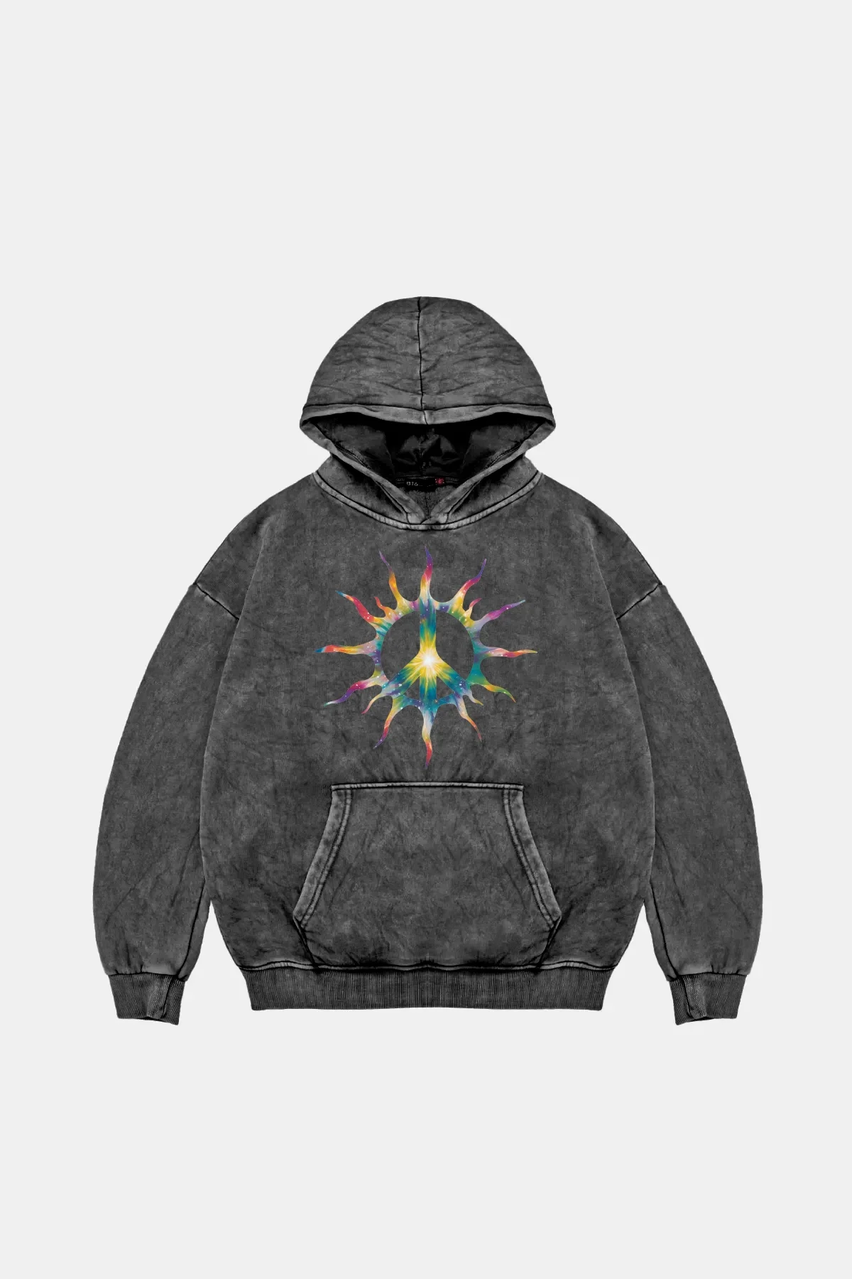 Peace Baskılı Oversize Unisex Yıkamalı Siyah Hoodie