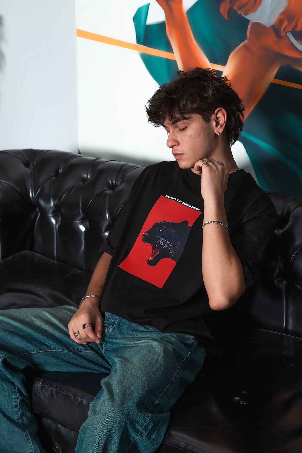 Yumuşak pamuk kumaşı, gün boyu rahatlık ve ferahlık sağlar. Özel kumaş dokusu ise t-shirt’e kendine özgü bir hava katarken, oversize kesimi vücuda oturmadan özgür bir hareket imkanı sunar. Power Of Darkness baskısı, sokak modasına asi bir hava katıyor.