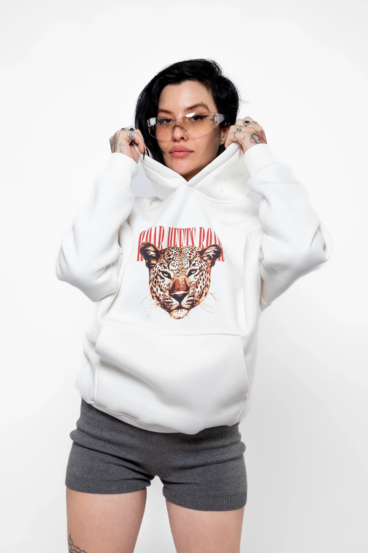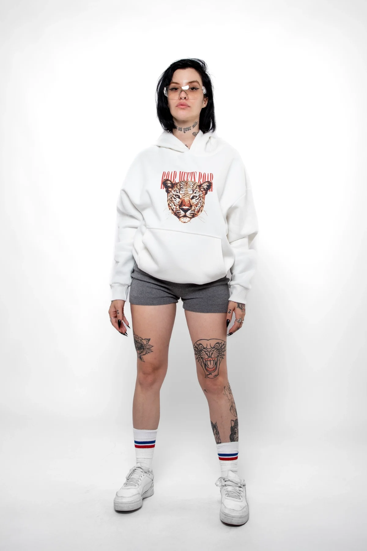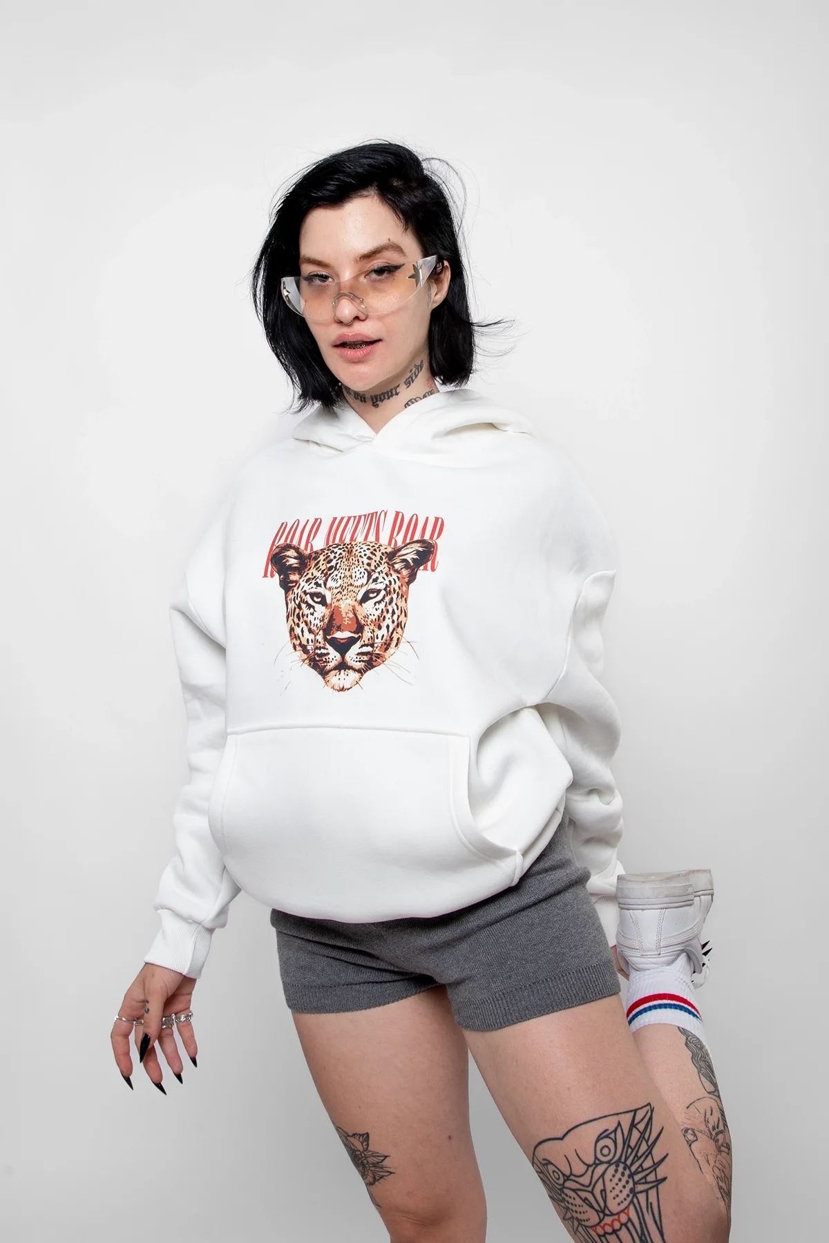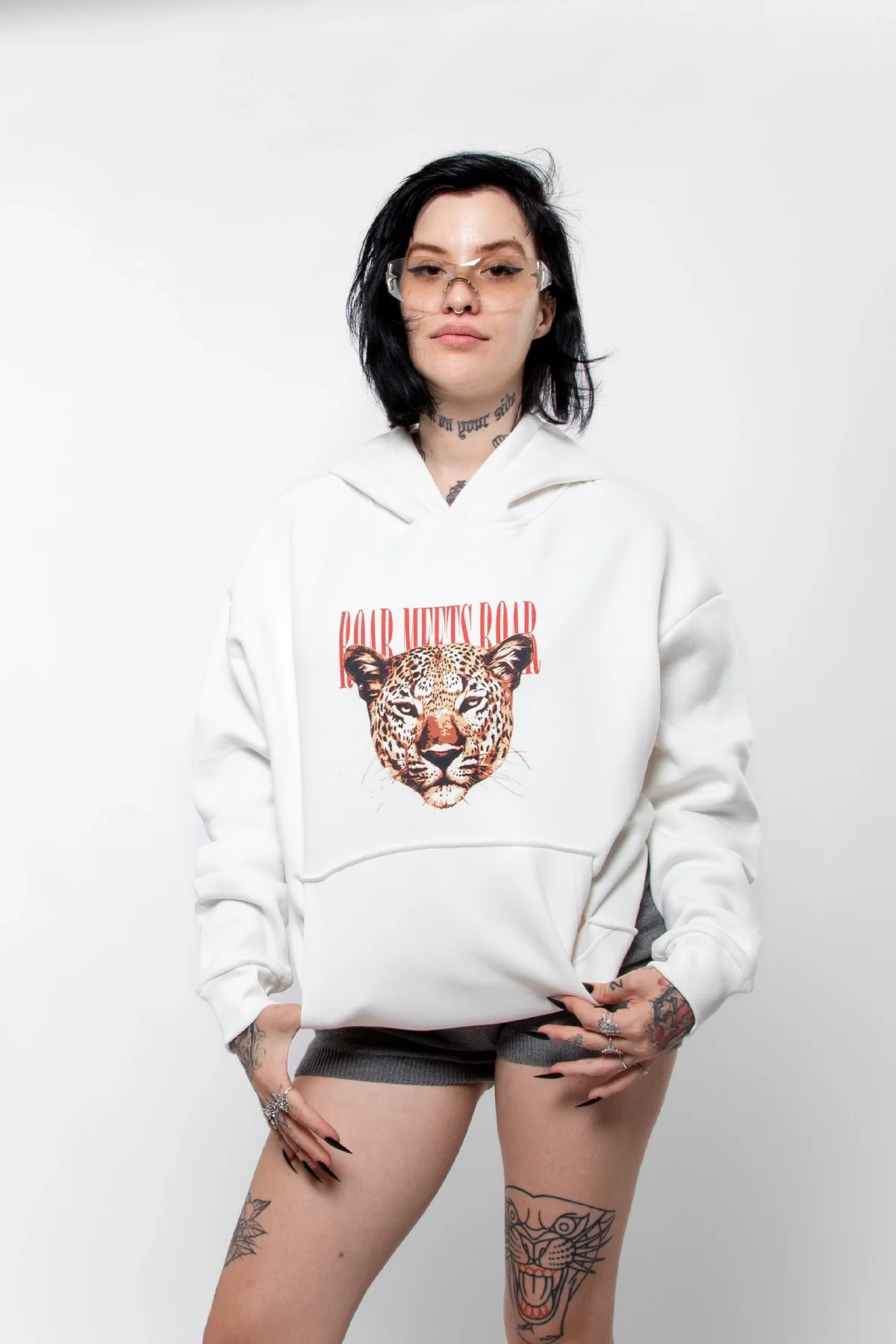 Roar Meets Baskılı Hoodie, oversize kesimi ve zamansız Beyaz rengiyle hem konforu hem tarzı bir araya getiriyor. Göğüs kısmındaki yazısı ve baskı detayıyla enerjik ve özgün bir görünüm sunar.