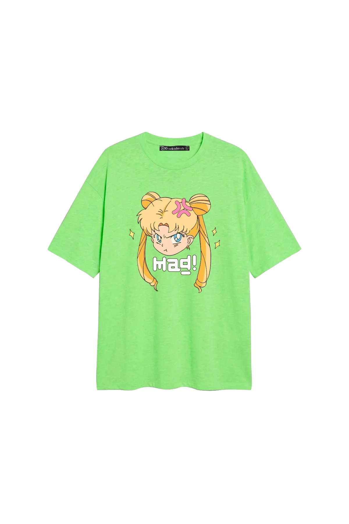 Sailor Moon Baskılı Rahat Kalıp 30/1 Unisex Yeşil Tshirt