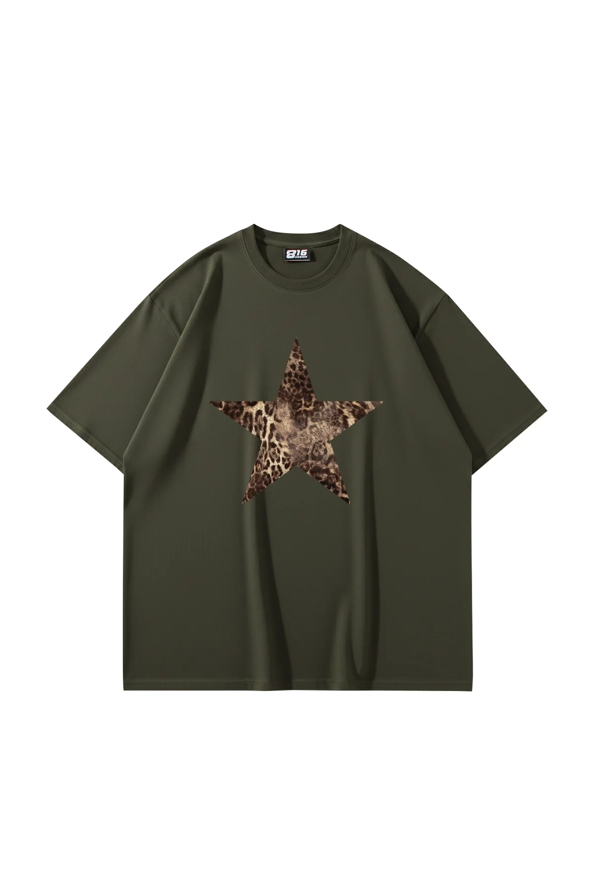 Starz Leopar Baskılı 24/1 Oversize Unisex Haki Tshirt