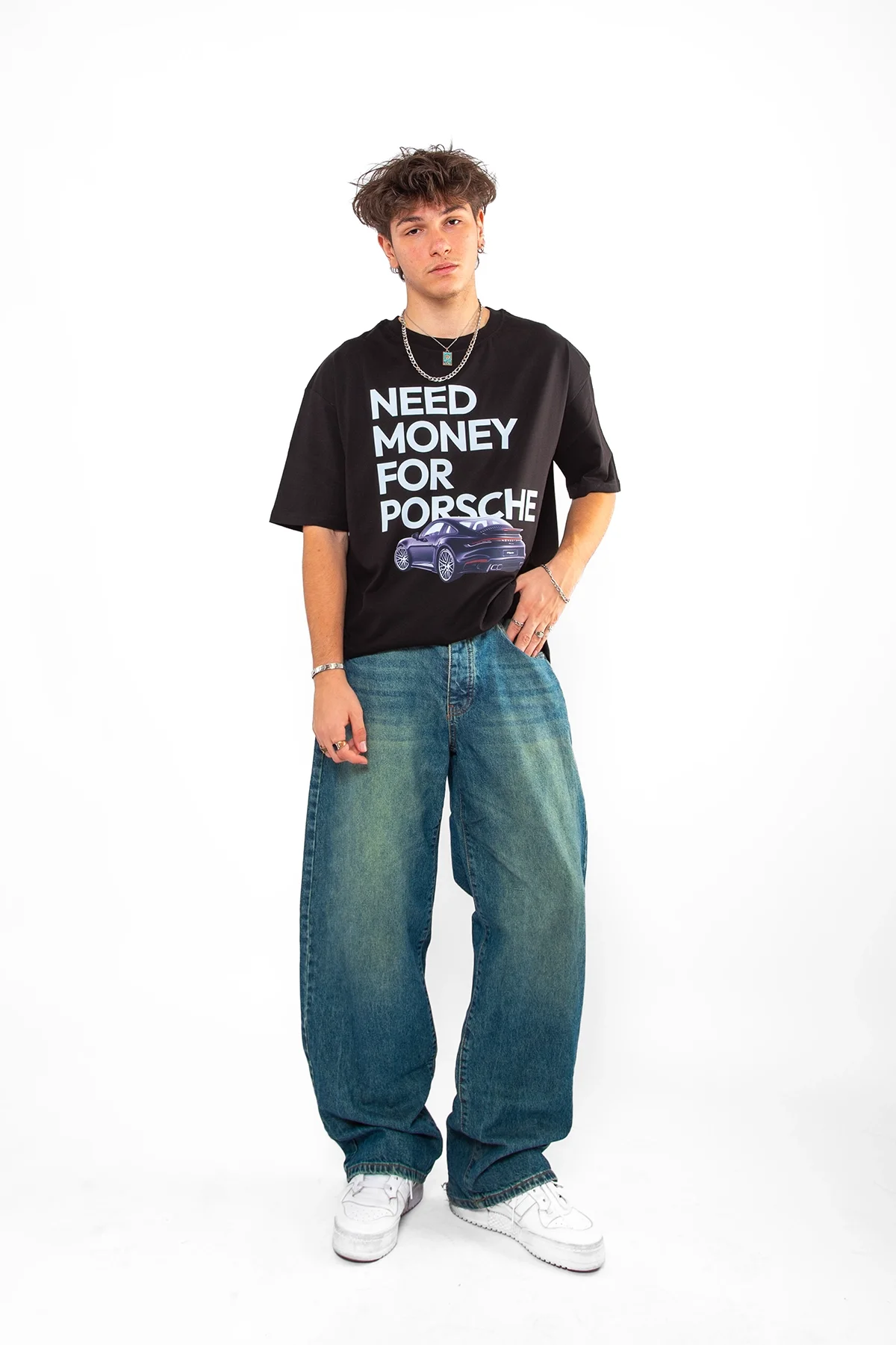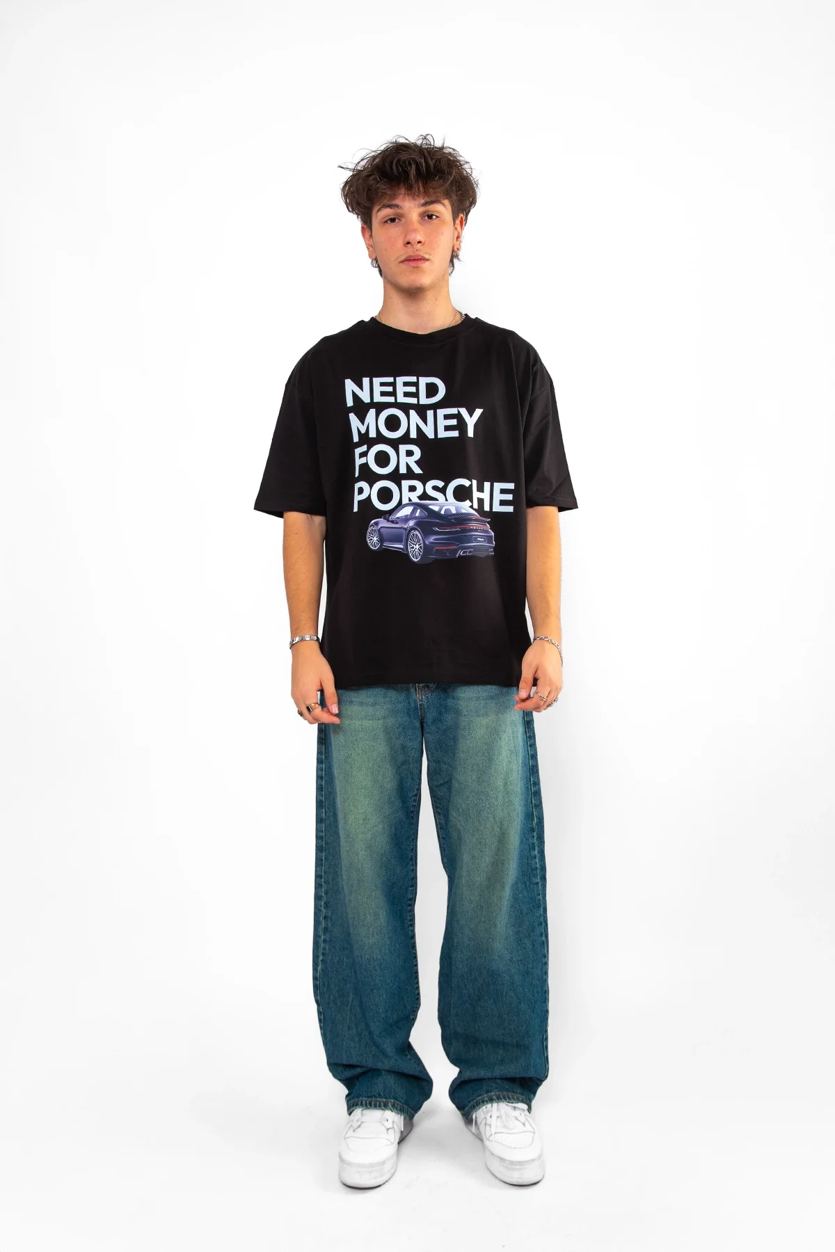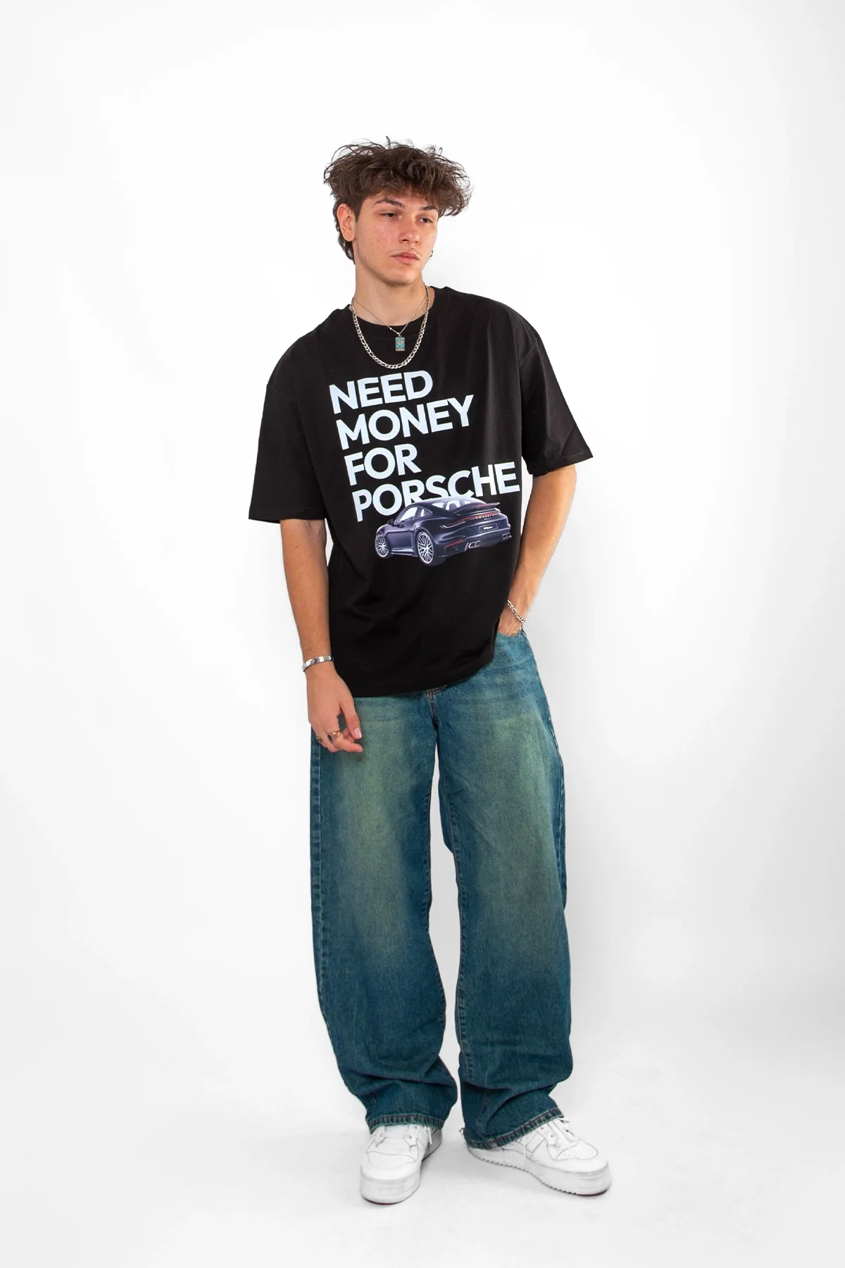 V2 Need Money For Porsche Baskılı Oversize Unisex Siyah T-Shirt