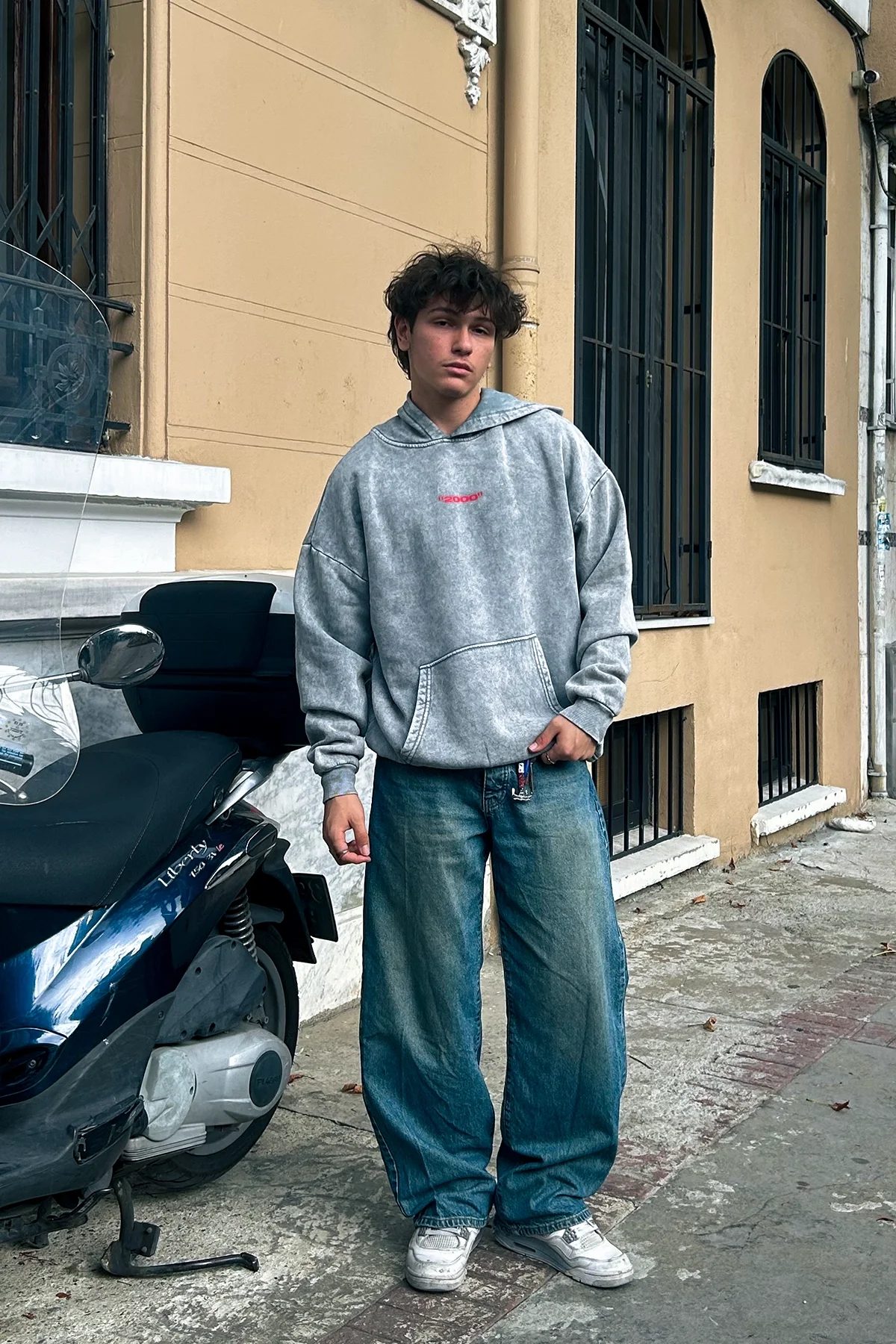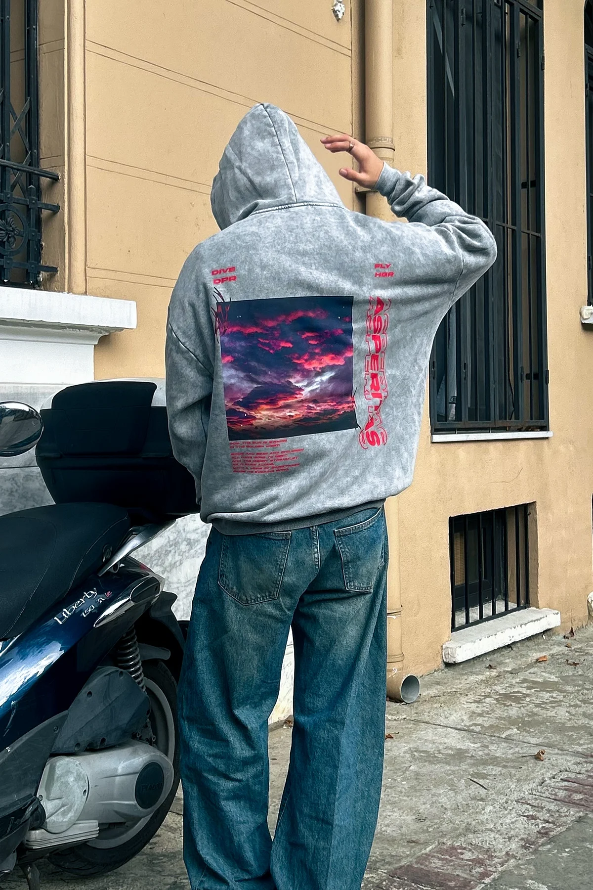 Yıkamalı Beyaz Asperitas Sırt Baskılı Oversize Unisex Hoodie