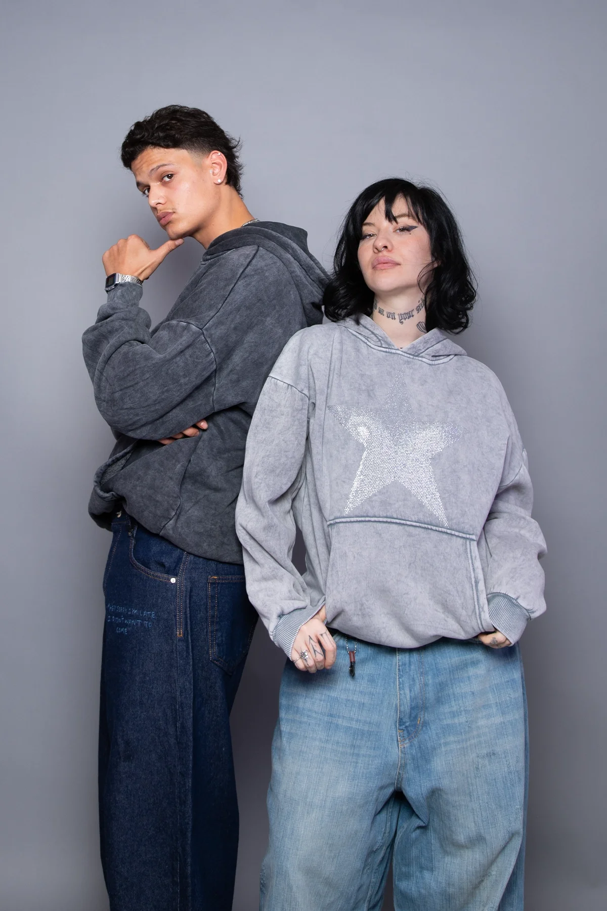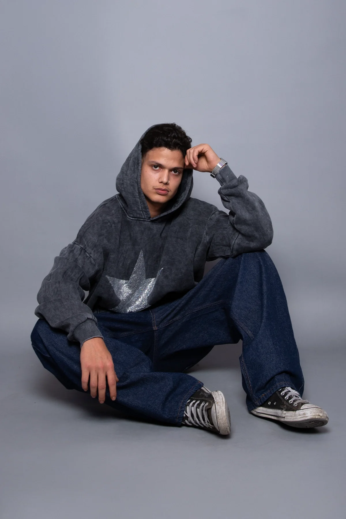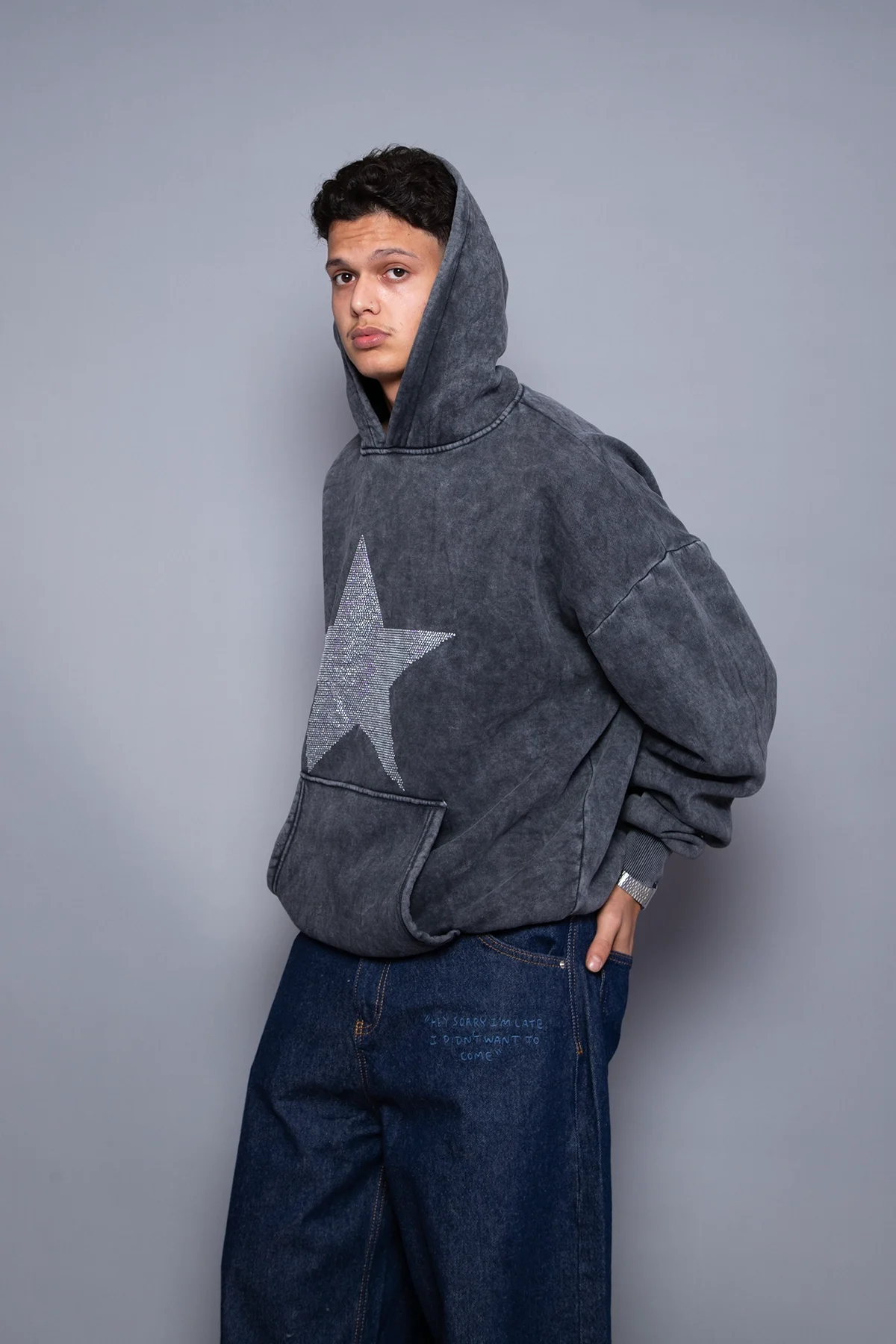 Yıldız Taş Baskılı Oversize Unisex Yıkamalı Siyah Hoodie